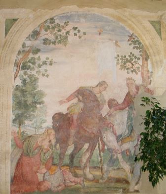 - Descrizione: 010672 - Particolare - Un re a cavallo incontra un personaggio pure a cavallo, mentre una donna piange.