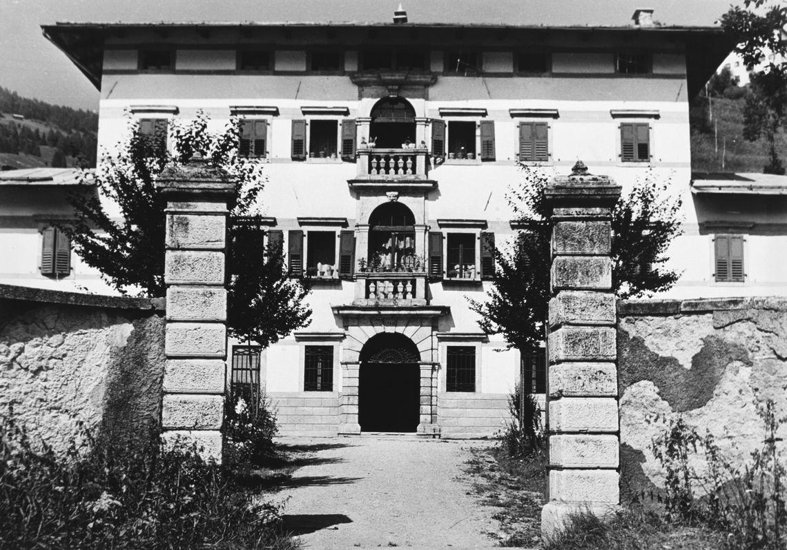 - Descrizione: L'ala ovest del corpo padronale ha le pareti e il soffitto foderati da pannelli in legno dipinti, con quadrature architettoniche in cui si aprono paesaggi montani; inoltre ci sono anche medaglioni con testine, decorazioni a motivi floreali e, agli angoli, le raffigurazioni delle quattro stagioni.