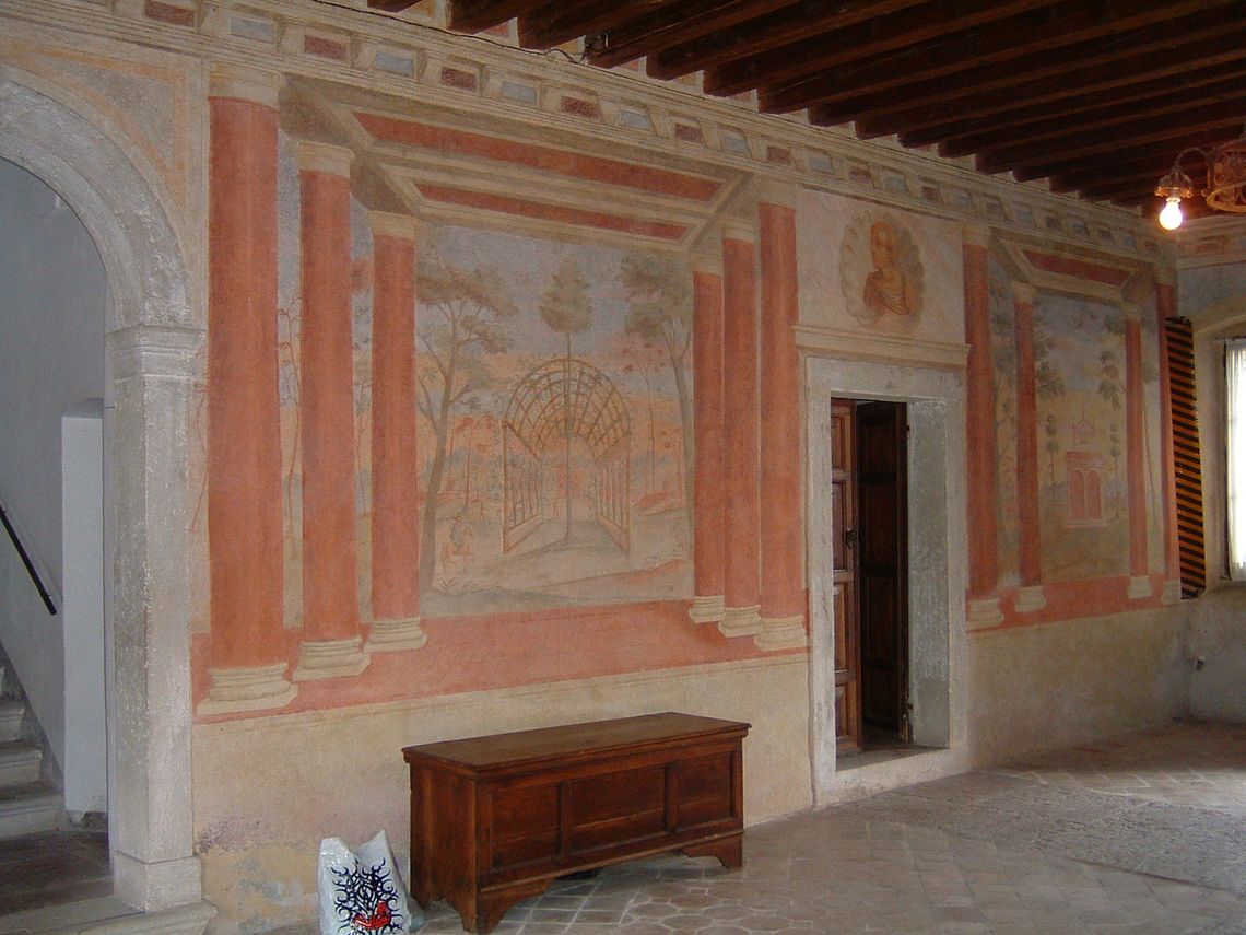 - Descrizione: Il salone al pianterreno ha le pareti interamente affrescate con scene agresti inquadrate da finte architetture.