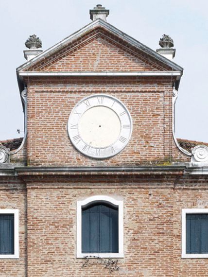 - Descrizione: Un orologio decorativo è posto al centro della sopraelevazione rettangolare sormontata da un timpano.