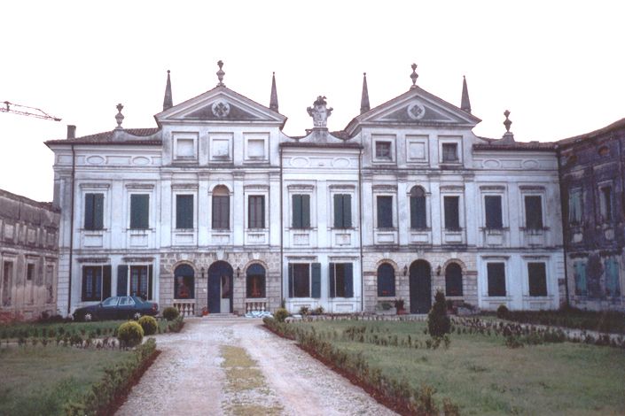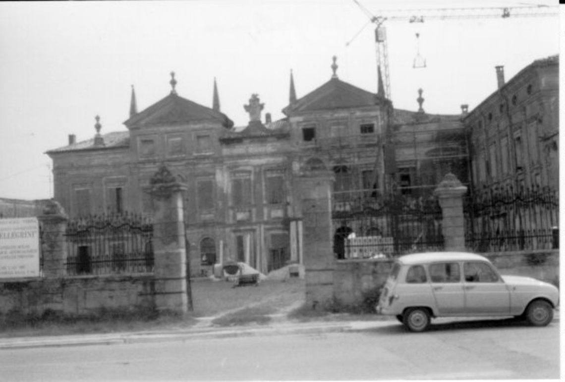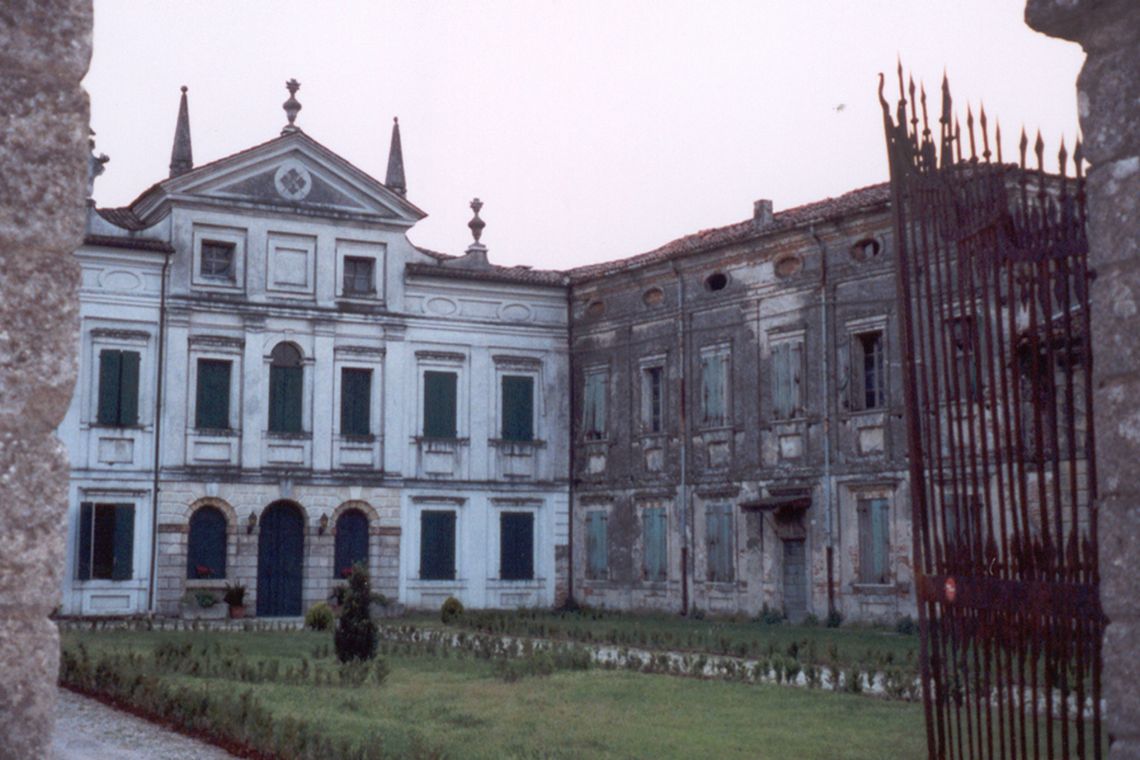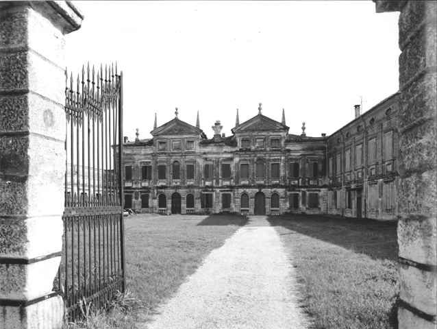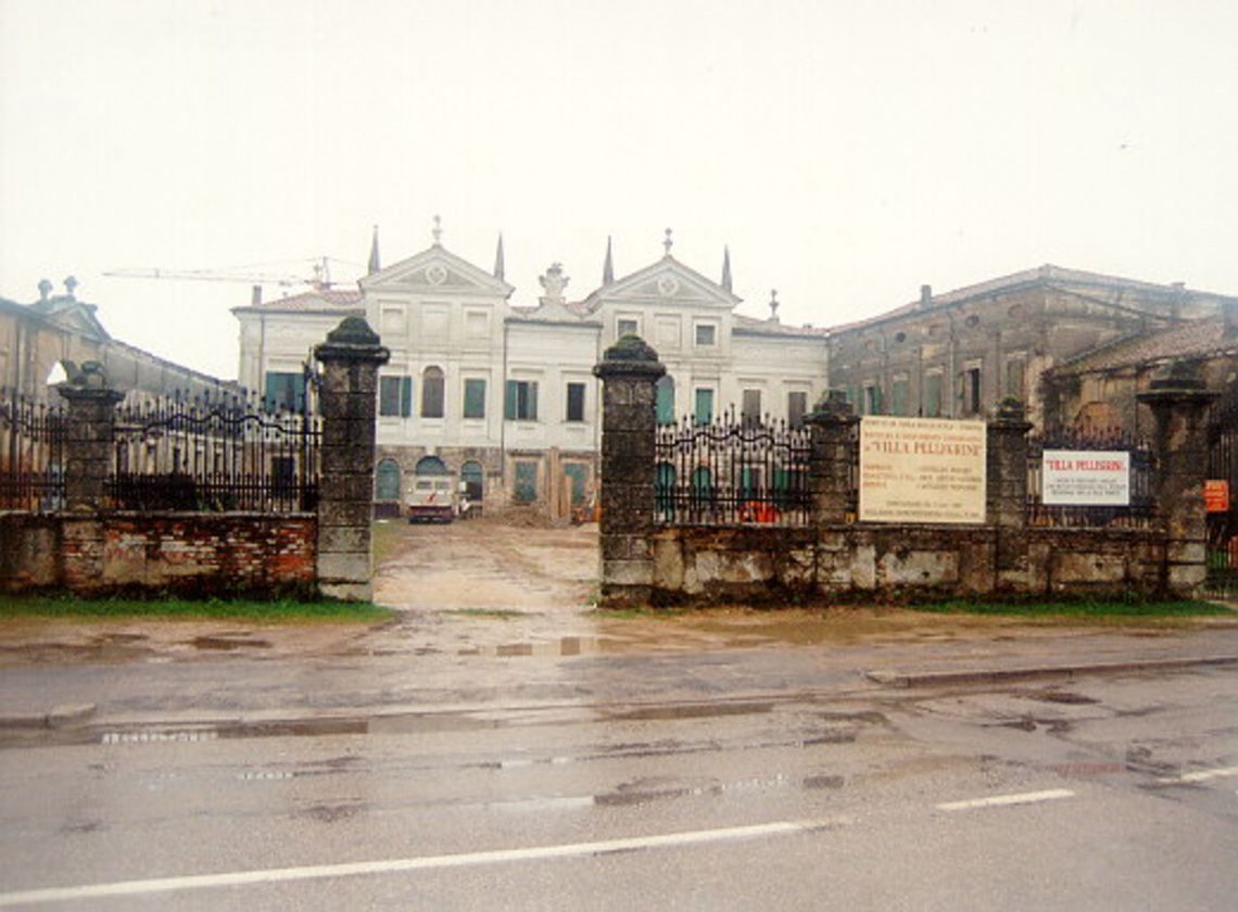 - Descrizione: Il salone è decorato da un fregio a panoplie in monocromo verde che scandiscono un'architettura mistilinea dipinta sui toni del rosa. Altri trionfi d'armi abbelliscono i cornicioni superiori delle finestre a meridione e delle porte verso il salone. Elementi architettonici più semplici incorniciano gli altri lati delle finestre, dell'arcata di collegamento con l'atrio e della porta che dà sul brolo. Sui due ingressi del salone svettano due stemmi: il primo (ritoccato), in cui si scorgono le insegne dei Pellegrini e dei Campagna, corona la porta posteriore a sud e riporta i nomi di Francesco Pellegrini (in realtà, lo sposo fu Giovanni) e di Anna Campagna (per quanto dai caratteri ripassati sembri emergere il cognome Canpanini) con la data «1729»; il secondo, con gli stemmi Pellegrini e Sagramoso, orna l'arcata di fronte (a settentrione) e segnala i nomi di Ottaviano Pellegrini e Lucrezia Sagramoso, ancora con la medesima data, corrispondente all'anno del loro matrimonio: anno che costituisce un valido ancoraggio cronologico per l'esecuzione delle pitture. La stanza, a occidente rispetto al salone principale, è abbellita da un fregio a fondo giallo nel quale si dipanano soggetti tratti da un repertorio eterogeneo, organizzati in impaginazioni simmetriche: si possono osservare chinoiseries, singeries, motivi classicheggianti, elementi architettonici da giardino, quali fontane e pergolati costruiti prospetticamente. Le pareti della stanza successiva presentano un fregio a motivi architettonici orchestrato sui toni del rosa, del verde e del rosso, con conchiglie, vasi di fiori. Agli angoli, i motivi architettonici si prolungano verso il basso con motivi sinuosi. Attorno a due specchi murati sui lati maggiori sono dipinte cornici sugli stessi toni cromatici e con le medesime tipologie iconografiche.