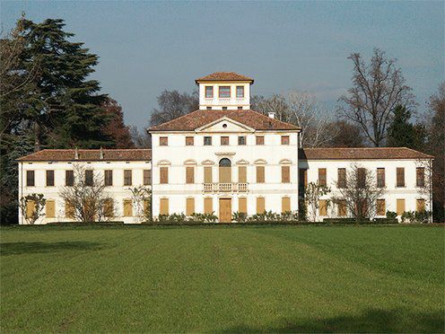 - Tipo: cornicione a dentelli; poggiolo, timpano con pinnacoli su prospetto ovest