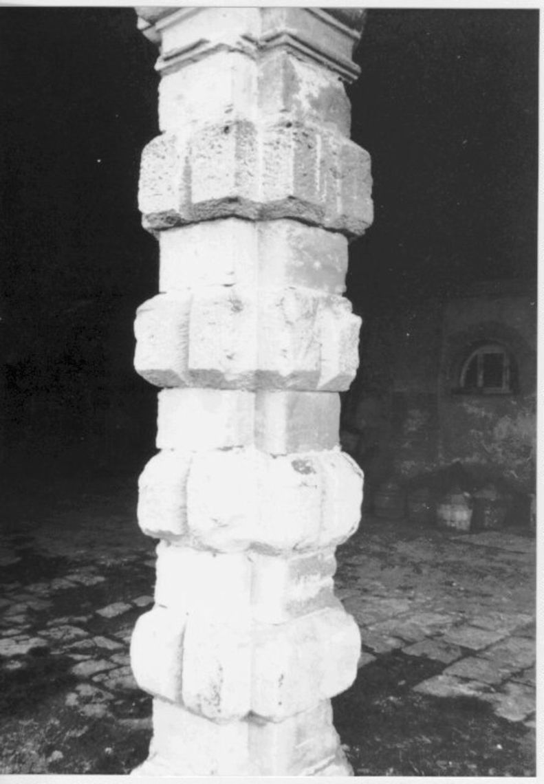 - Descrizione: Il portale d'ingresso del fronte verso la strada, presenta un profilo centinato ed è inquadrato da due lesene ioniche a grosse bugne, sulle quali poggia un frontone triangolare.
