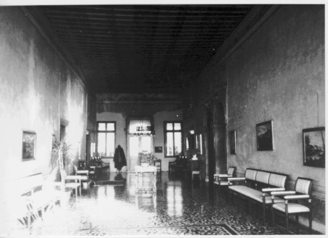 - Descrizione: All'interno, il salone centrale, alto e lungo quanto l'edificio, presenta il soffitto in travi lignee decorate.