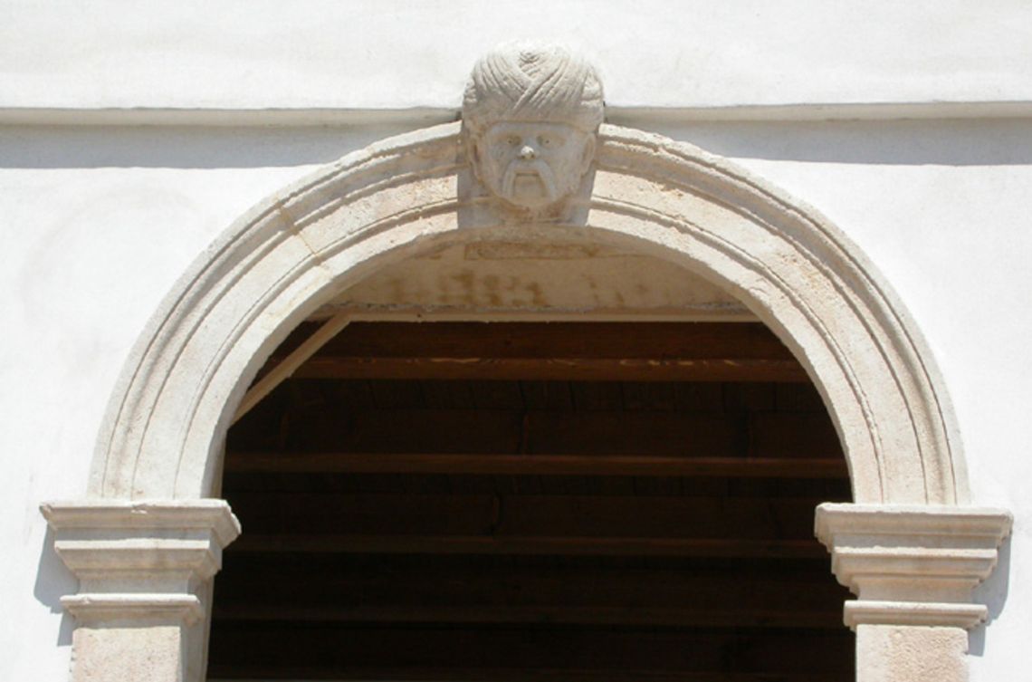 - Descrizione: Portale d'ingresso sul fronte sud: la piccola testa scolpita suggella la chiave di volta dell'arco centinato e si collega alla soprastante cimasa in lieve aggetto.