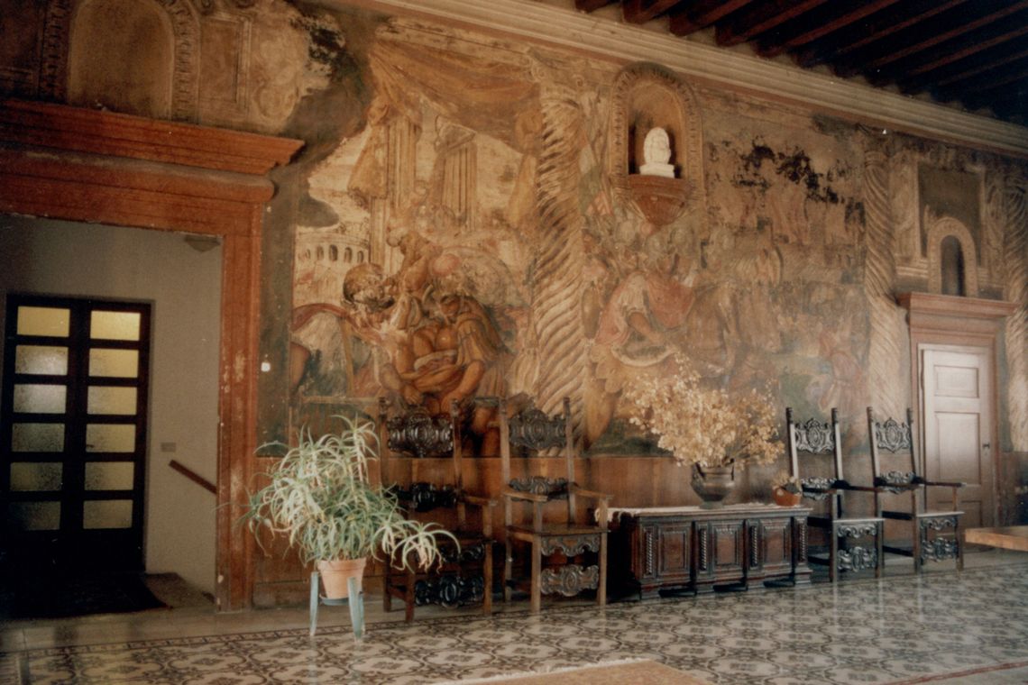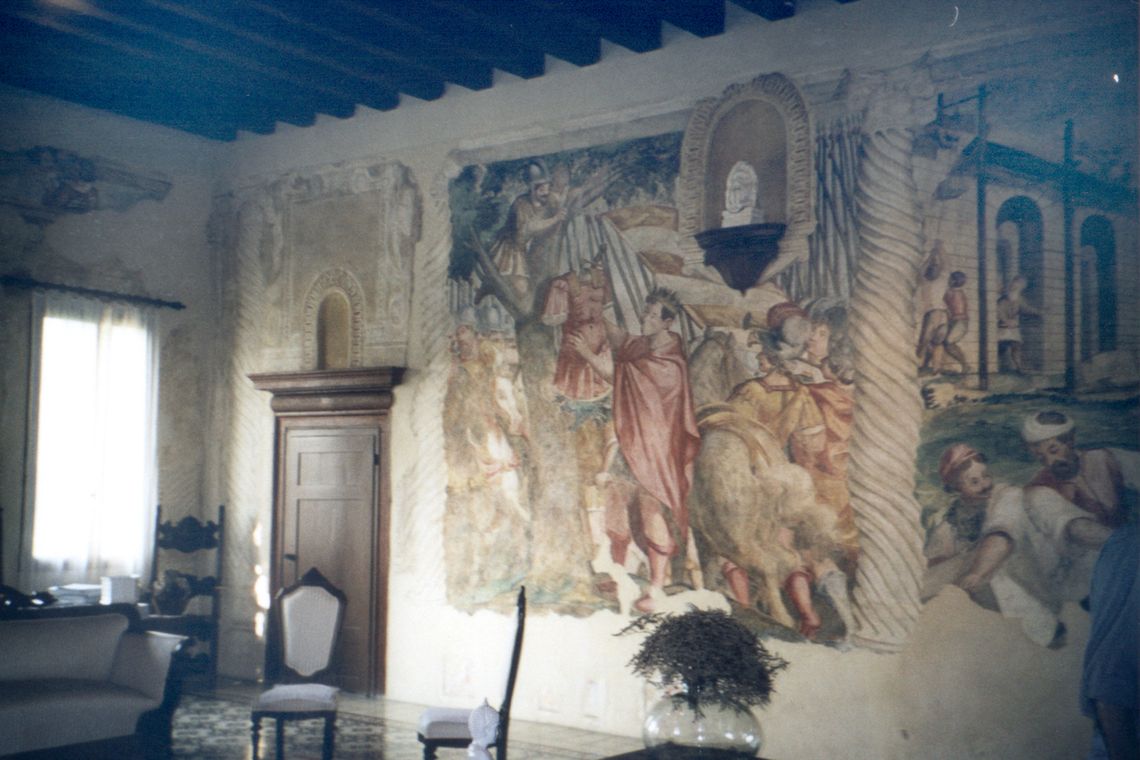 - Descrizione: Il salone centrale propone la parte più bella e interessante della villa. Sono infatti rappresentati alle pareti quattro episodi che celebrano le gesta della famiglia Grimani con scene di guerra, l'incendio di un castello, forse quello di Cologna con la sua fortezza, l'incoronazione di un personaggio che ha deposto l'armatura, un doge Grimani, e la costruzione di una grande opera edilizia, forse la fortezza di Palmanova.