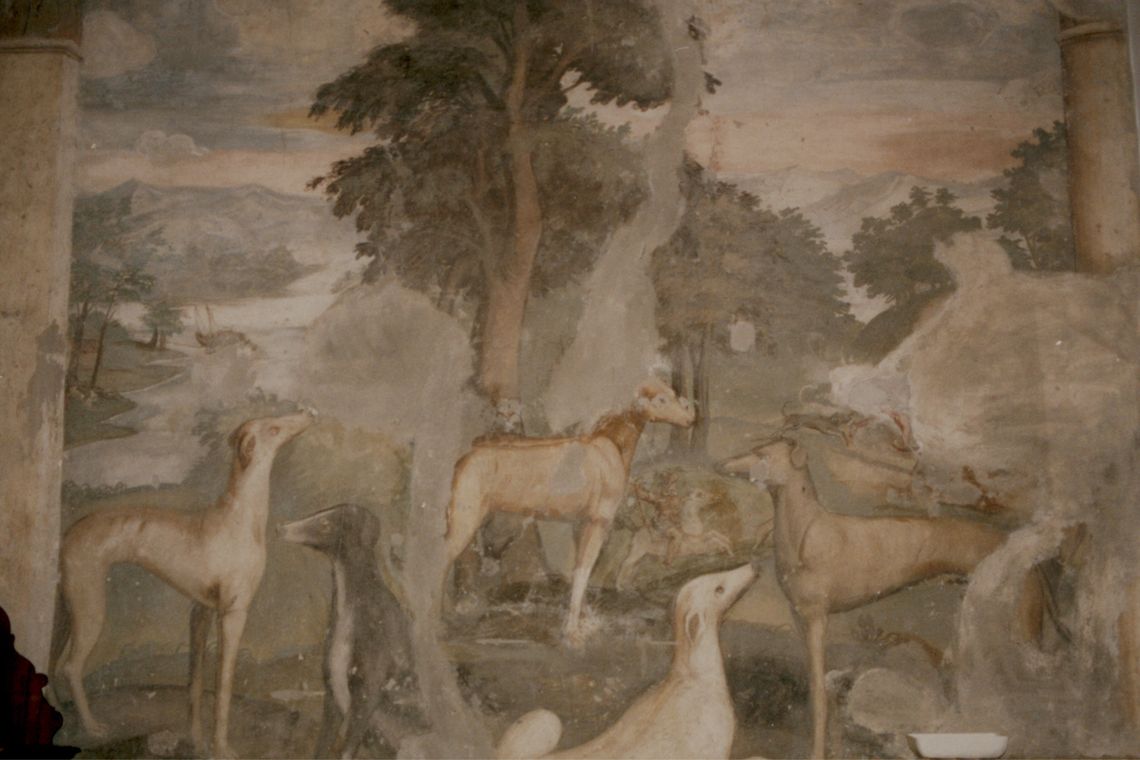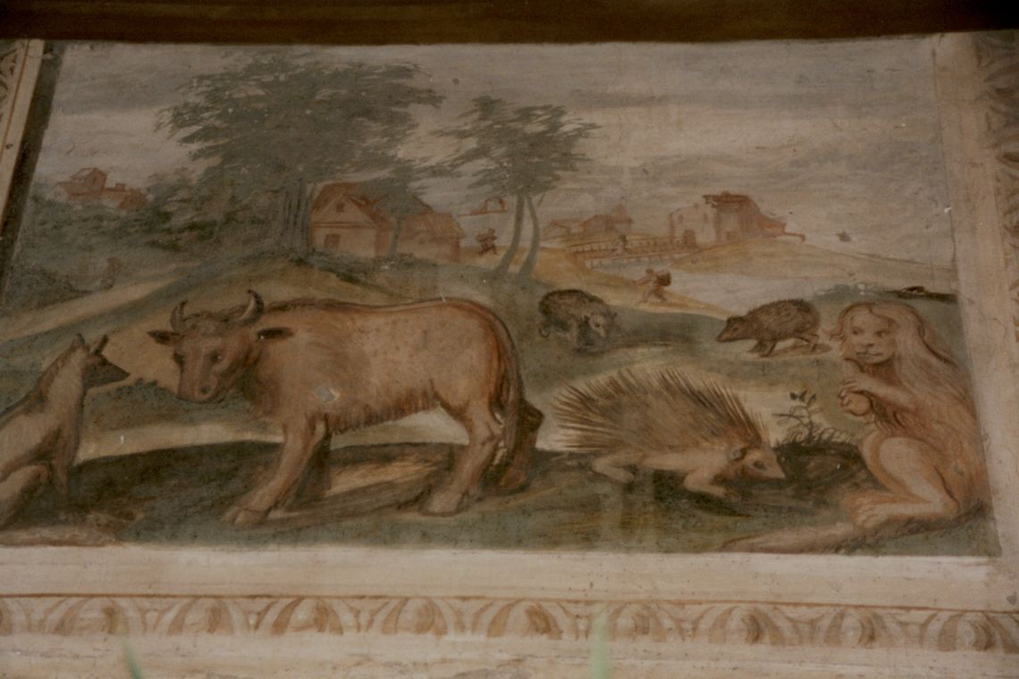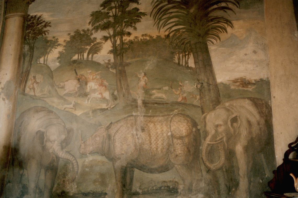 - Descrizione: Altre stanze sono poi affrescate con soggetto esotico e con scene di «caccia al cinghiale, al cervo, all'orso, all'elefante ed al rinoceronte e con altre scene di animali (scimmie, cavalli, istrici, maiali ecc.) di grandezza naturale»