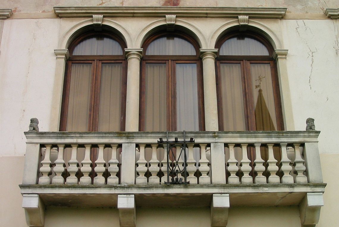 - Descrizione: Tra le finestre dellultimo piano sono riconoscibili a stento le allegorie femminili della "Fam"a e dell"Abbondanza". Al livello inferiore comparivano una scena con tre uomini e tre donne, un grande riquadro con una nave, allusiva alla denominazione del ramo dei proprietari, e ai lati del poggiolo si trovavano le figure monocrome di "Mercurio" e di "Venere", ora scomparse. Un fregio di putti corre lungo tutta la facciata, tra le finestre del piano nobile e quelle superiori.