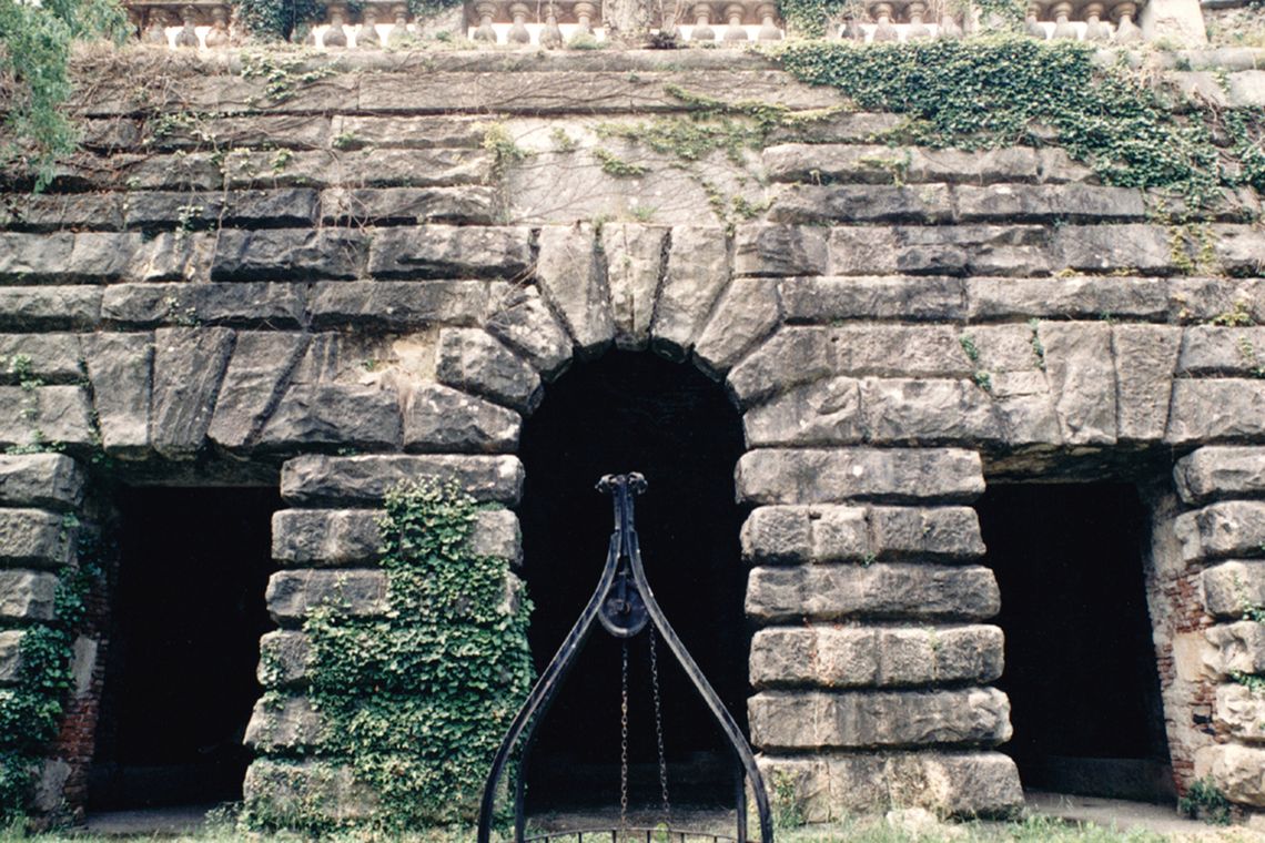 - Descrizione: La grotta-fontana è una poderosa struttura architettonica, a cui l'acqua giunge cadendo con un salto di alcuni metri; viene così suggestivamente descritta dal Da Persico: «sostentata a gran volte, s'apre un antro o spelonca, che ha dai lati due mura, le quali si spiccan dall'alto con tre magnifiche porte, tutte attorniate a bozze rustiche, e giù corrono con profili, canali, scale e muraglie di tal lavoro e solidità, che opera romana si crederebbe che fosse».