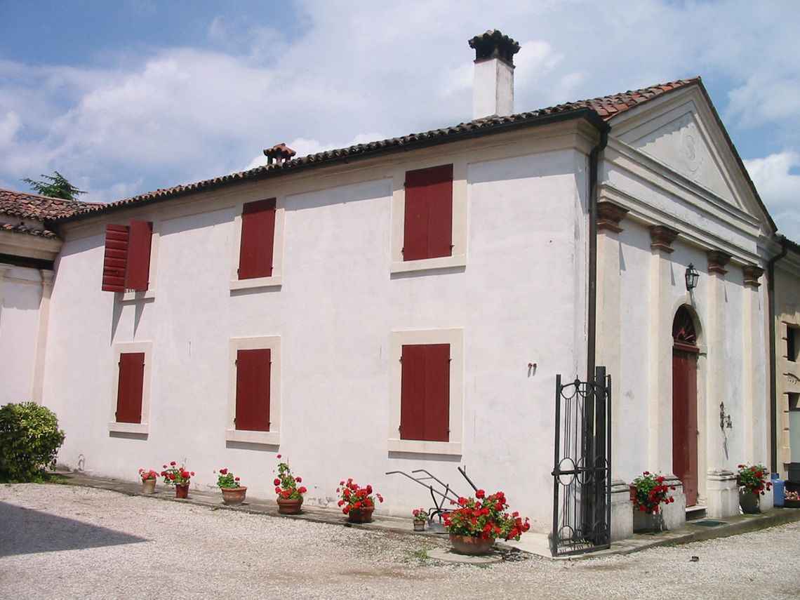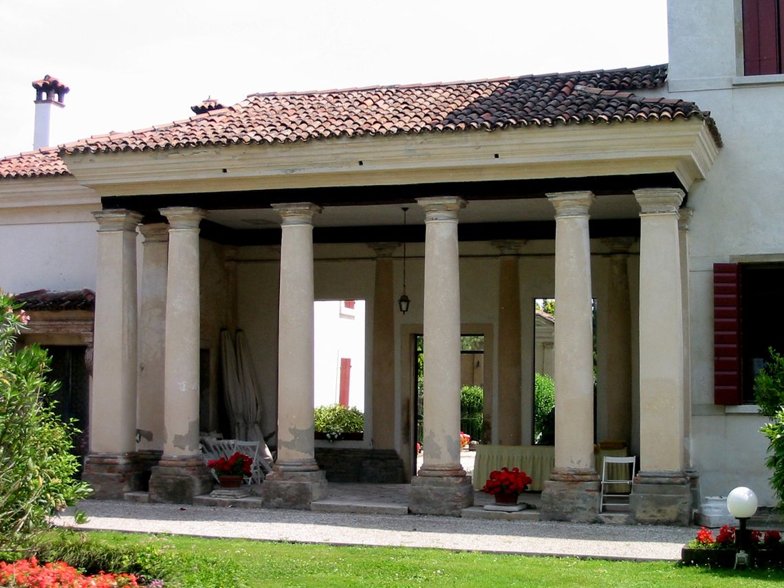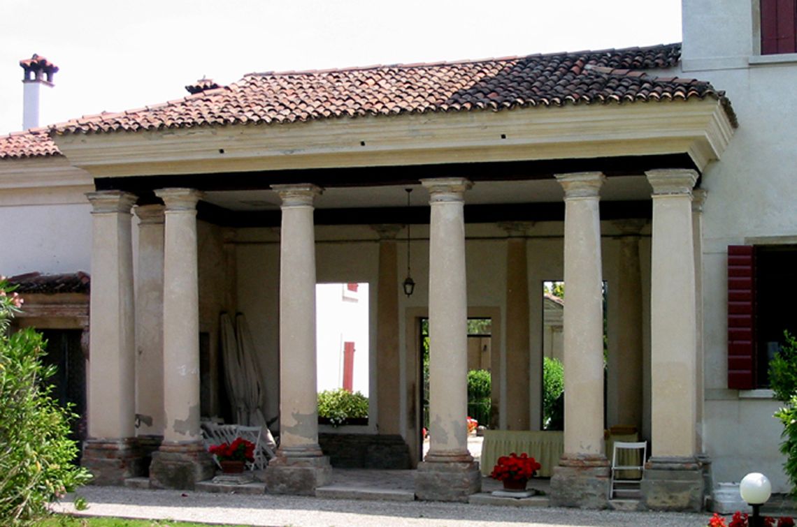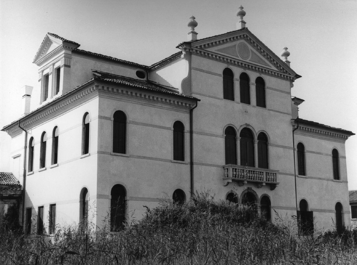 Complesso costituito da villa, ali affiancate, barchessa, rustico e oratorio. Villa a pianta rettangolare, su due piani, con facciate principali identiche. Parte centrale sopraelevata con lunghi abbaini incrociati e terminati da timpani triangolari. Finestre centinate e trifore centrali a piano primo e secondo. Vasi acroteriali sulla sola facciata principale. Ali laterali, su due piani, agganciate alla villa tramite due loggiati con colonne doriche. Lunga barchessa su due piani, disposta a L, con arcate a tutto sesto. Oratorio a Est della villa, a una navata, con timpano triangolare.Specifiche: