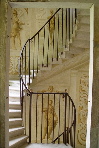 - Descrizione: Le pareti della scala sono decorate da una finta architettura, che presenta due nicchie ornate di mascheroni e panoplie, all'interno delle quali sono inserite due statue a monocromo in finto bronzo: la prima è una figura maschile con il busto in torsione che reca nella mano destra una spada e nella sinistra il fodero ("Virtù Guerriera"? "Fortezza"?); l'altra, una figura femminile con lo sguardo rivolto al cielo, colta in atto di sollevare la veste scoprendo le gambe. Potrebbe trattarsi forse della "Speranza".