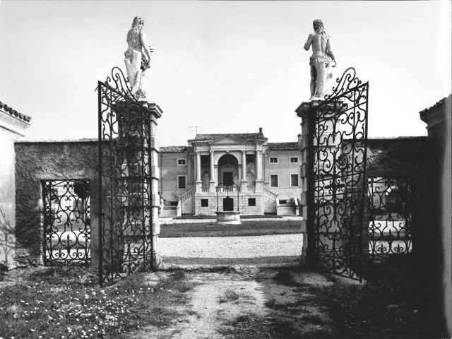 - Descrizione: La cancellata principale di ingresso alla villa con un cancello in ferro inquadrato da pilastri con statue di Adamo ed Eva.