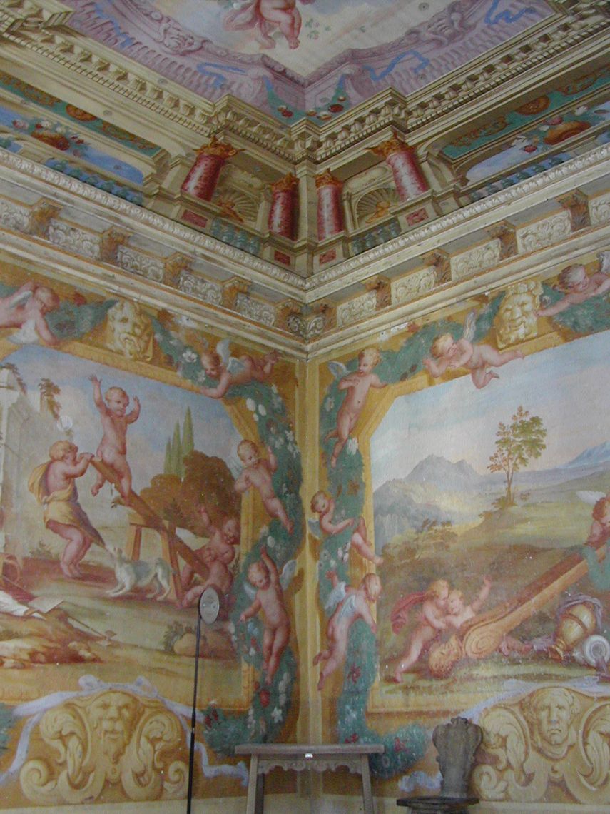 - Descrizione: Due stanze del piano nobile hanno una decorazione a travetti dipinti con motivi ornamentali a rosoncini, frutta e fogliame.