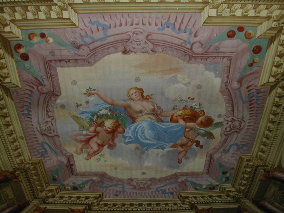 - Descrizione: La decorazione a fresco si estendeva originariamente in tutte le stanze del piano nobile e al salone centrale; ora è limitata ad alcuni lacerti alle pareti e al soffitto della prima stanza a destra e alle tre stanze di sinistra. Sono raffigurate scene mitologiche e storiche all'interno di quadrature architettoniche.
