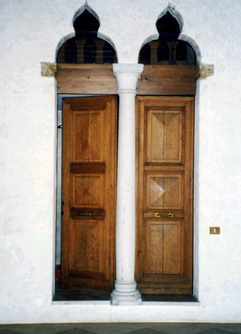 - Descrizione: Al piano nobile una portafinestra a monofora ha una cornice in pietra con decori all'imposte ed in chiave. Si affaccia su una balconcino sostenuto da mensole in pietra.