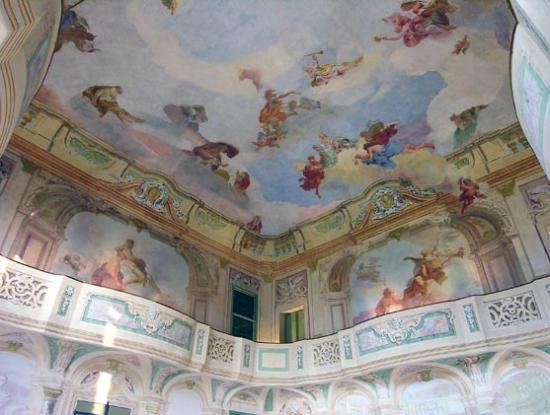 - Descrizione: Gli affreschi della sala da musica sono attribuiti a Giovanbattista Crosato (1686-1758). Al centro del soffitto il tema celebrativo raffigurato dalla fama con accanto Nicolò Da Ponte in veste di guerriero antico con cimiero e scettro del comando e la Fama, vera apoteosi del proprietario. Ai piedi del signore il leone di S. Marco e lo stemma di famiglia (il ponte delle guglie di Venezia) sorretto da un angioletto. Ai lati in basso del soffitto sono rappresentate le quattro stagioni.