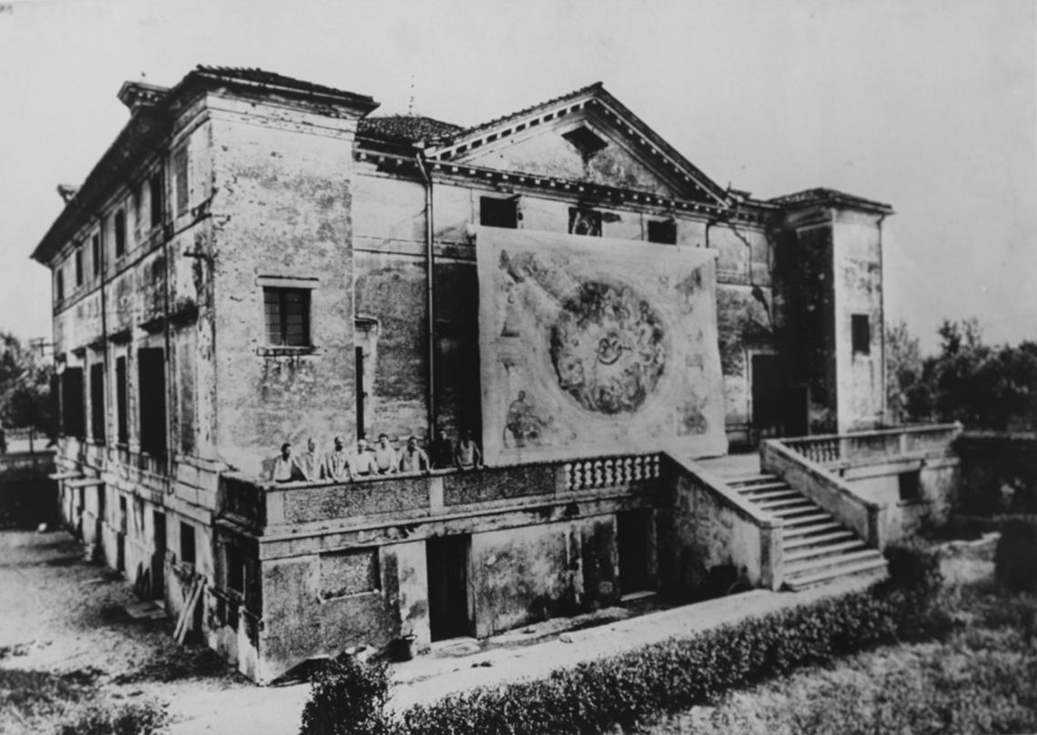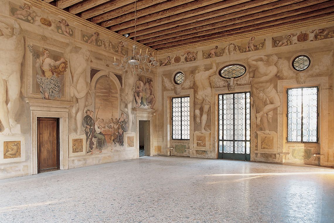 - Descrizione: L?apparato decorativo del salone si configura come una delle prove più elaborate e significative di Giovanni Antonio Fasolo. Vari elementi del repertorio manieristico ornano l?architettura illusiva. Immagini di vivacissimo risalto si affacciano dalle sovrapporte. Dai riquadri mediani sporgono due "Figure femminili" recanti l?una lo stemma dei Caldogno, d?oro all?aquila di rosso, e il ramo d?ulivo. Le sovrapporte angolari a loro volta inquadrano quattro coppie di "Prigioni". Il salone, però, è caratterizzato dalla presenza di affreschi rappresentanti scene di vita in villa: il "Concerto" e la "Merenda", sulla parete occidentale; e la "Partita a carte" e la "Danza", su quella orientale.