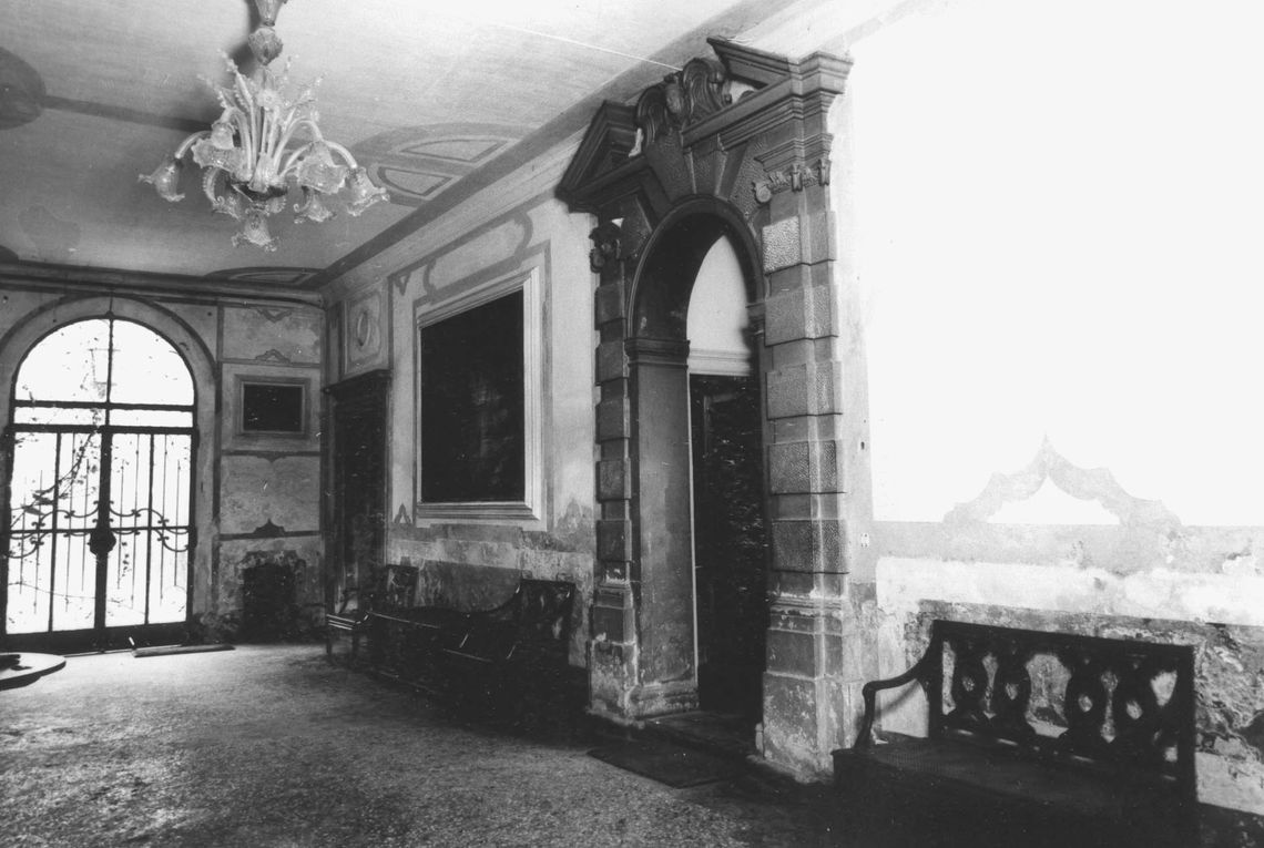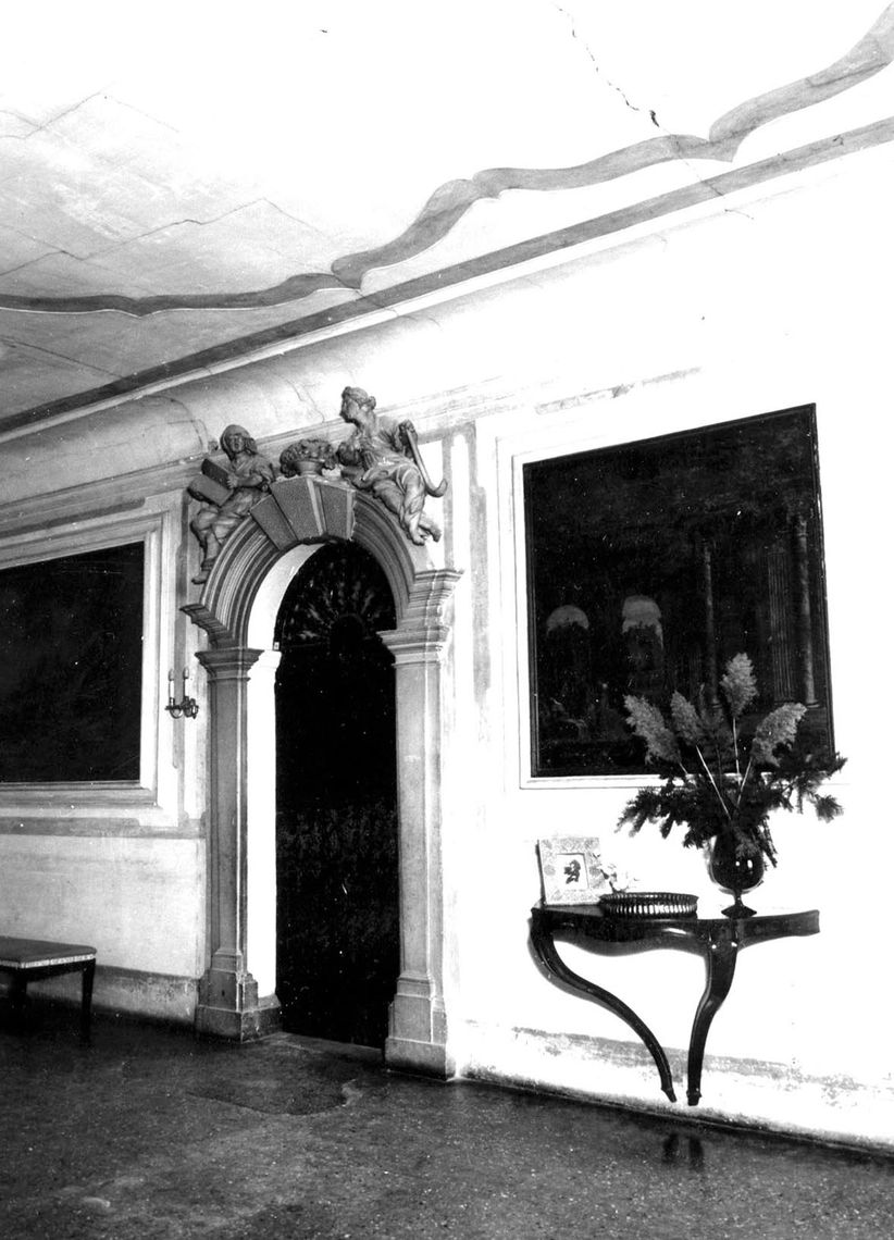 - Descrizione: Portale interno archivoltato, di accesso alla scala, con cornice aggettante su cui poggiano due figure femminili.