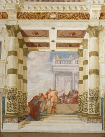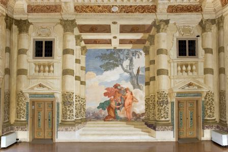 - Descrizione: Nel salone centrale della foresteria sono presenti vari affreschi attribuiti a Pietro Liberi, inquadrati da finti ordini architettonici eseguiti da Domenico Bruni.