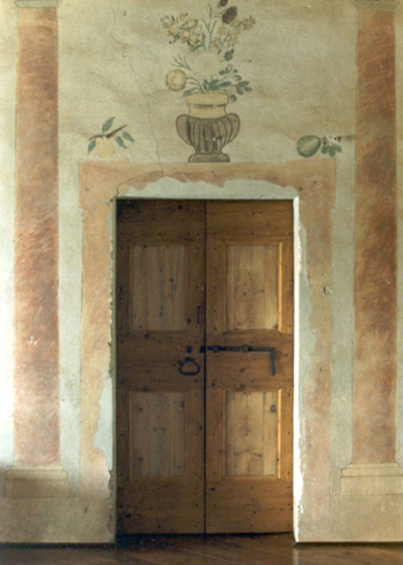 - Descrizione: 013366 - affresco; decorazione con finte colonne, paesaggi, sovrapporta con un vaso di fiori