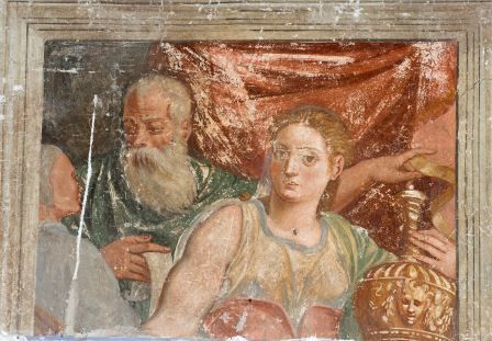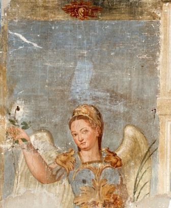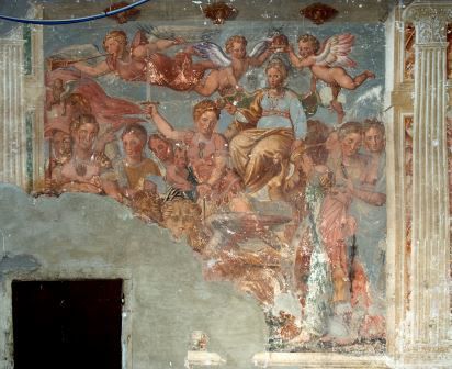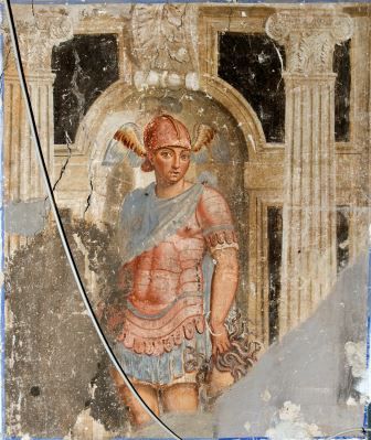 - Descrizione: Della decorazione pittorica è leggibile una cornice a ovuli dipinta a monocromo al di sotto dell'orditura in legno del soffitto. Sotto la finta cornice corre una fascia di intonaco ridipinto, forse in origine rivestito da una cornice lignea. Oltre questa fascia le pareti dipinte sono divise in due registri di pari altezza: quello inferiore sembra imitare rivestimenti a finto marmo o a finta tappezzeria; quello superiore è ritmato da telamoni in terra gialla in corrispondenza dei mensoloni, che reggono la travatura maggiore. I telamoni scandiscono Scene di battaglia con guerrieri vestiti all'antica. La finestra orientale della parete sud è coerente con la decorazione pittorica, mentre le altre aperture sono state inserite o rettificate "in rottura". L'eccessiva lacunosità e le condizioni di degrado degli affreschi, che comunque conservano tracce di una cromia vivace, non consentono al momento una lettura critica.