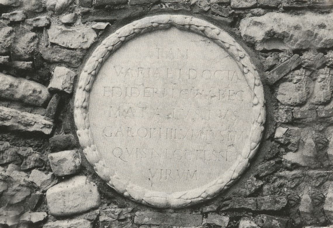 - Descrizione: Su questa facciata della villa, al di sotto di una visiera in pietra, si trovano due medaglioni monocromi con profili maschili laureati circondati da centine, dipinte anch'esse a monocromo. La visiera, in asse con la sottostante bifora del primo piano, è collocata quasi alla sommità della parete dall'impianto a capanna con tetto a due salienti.