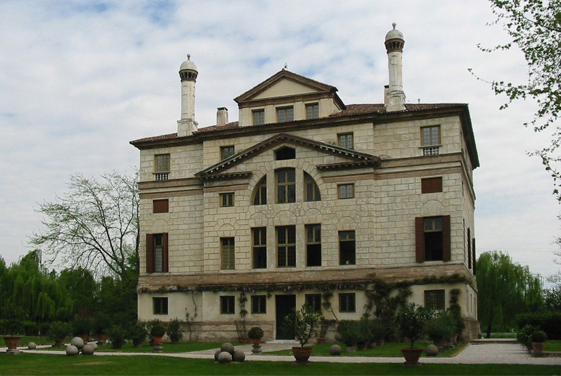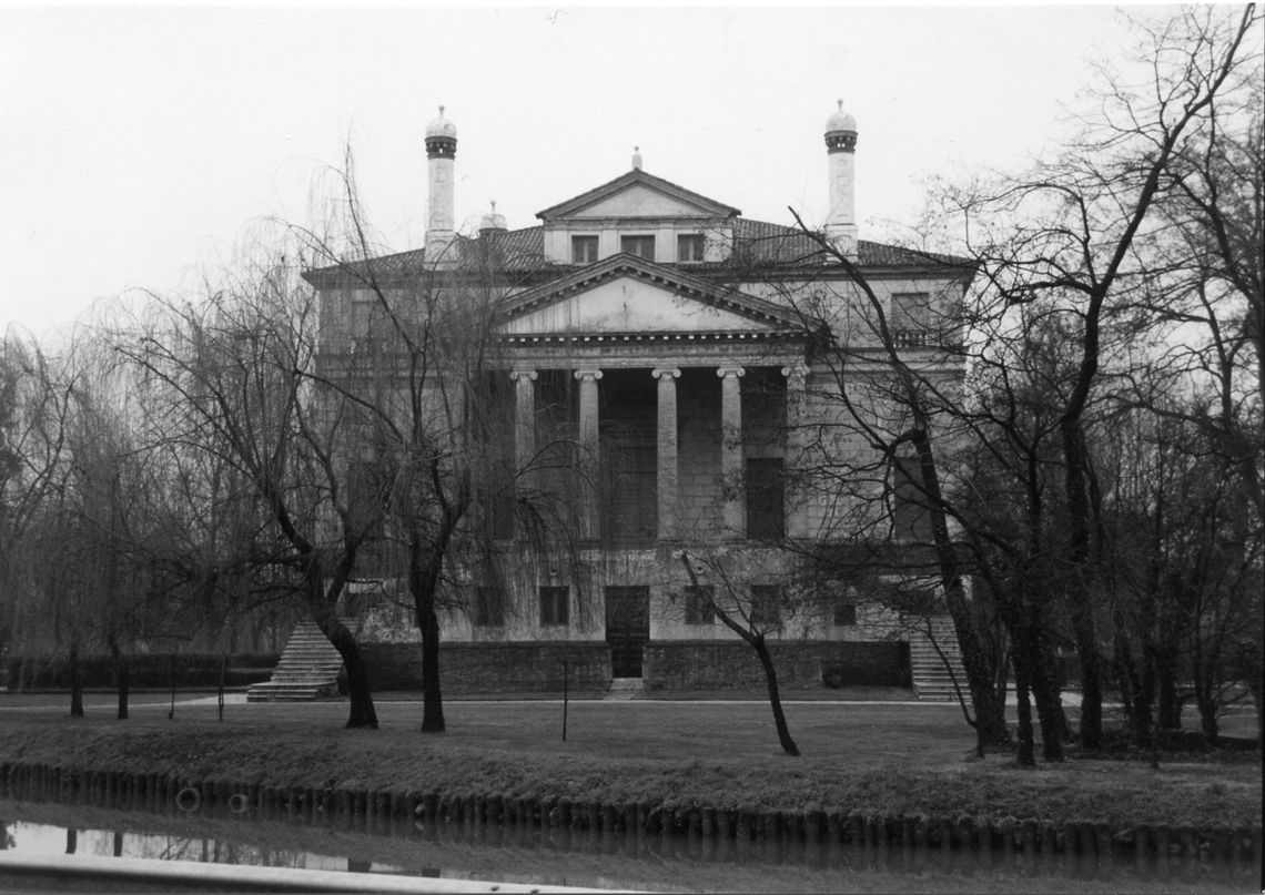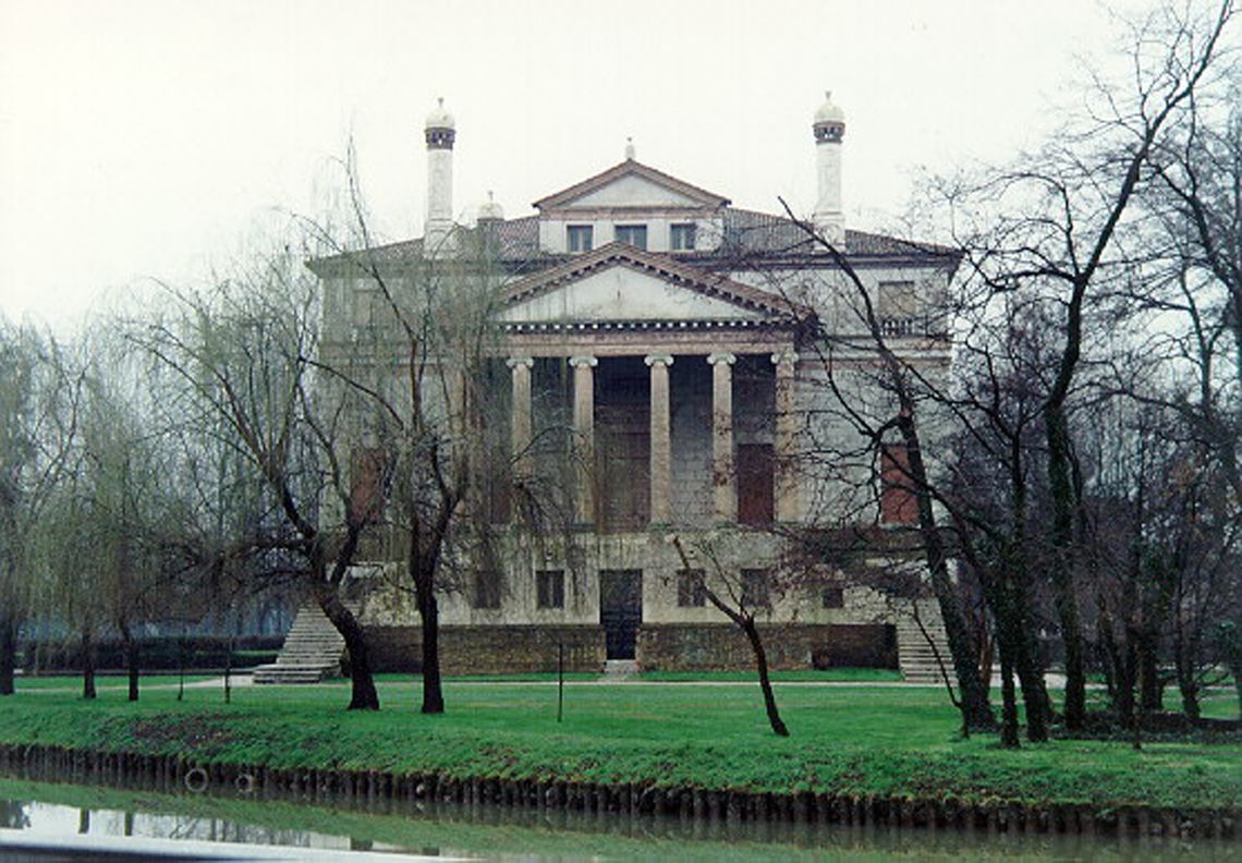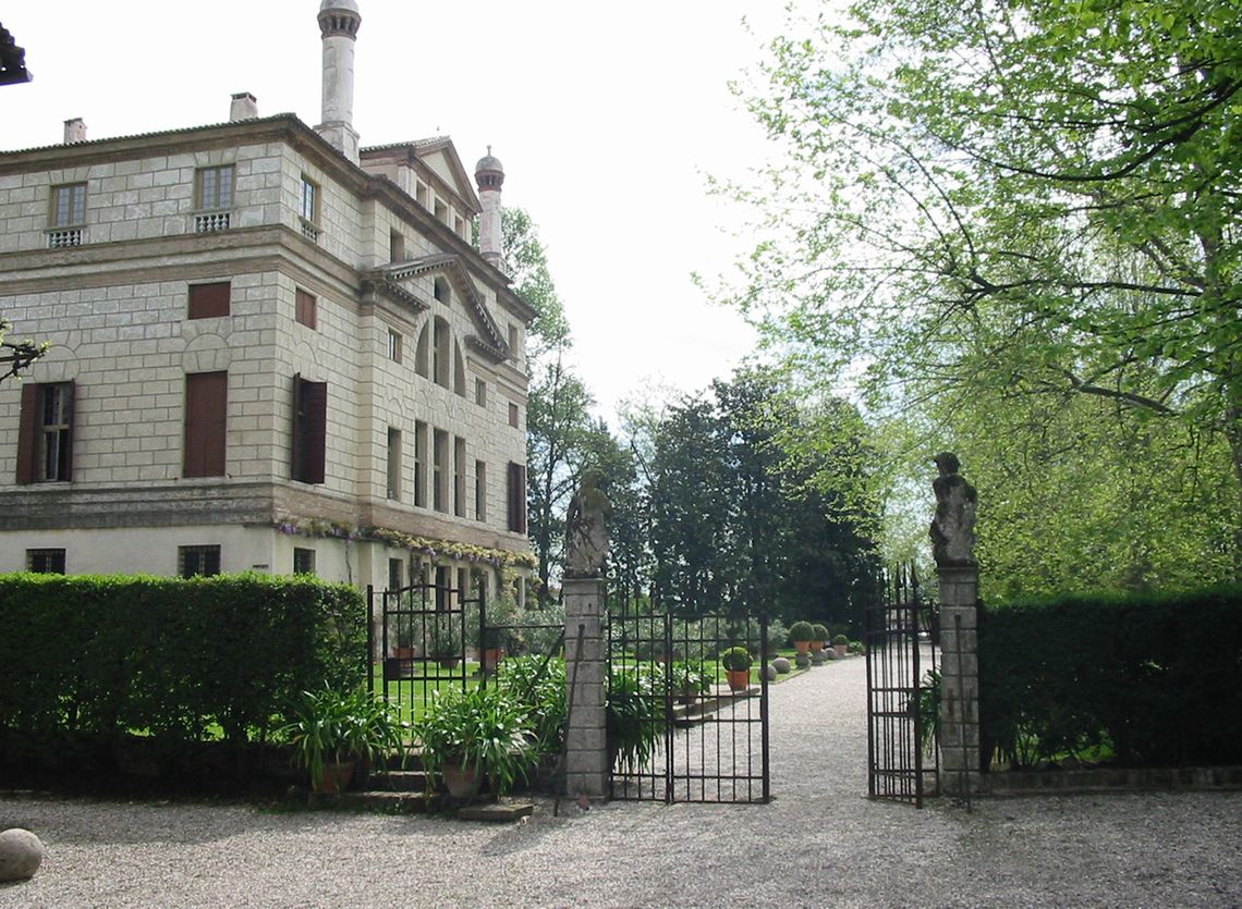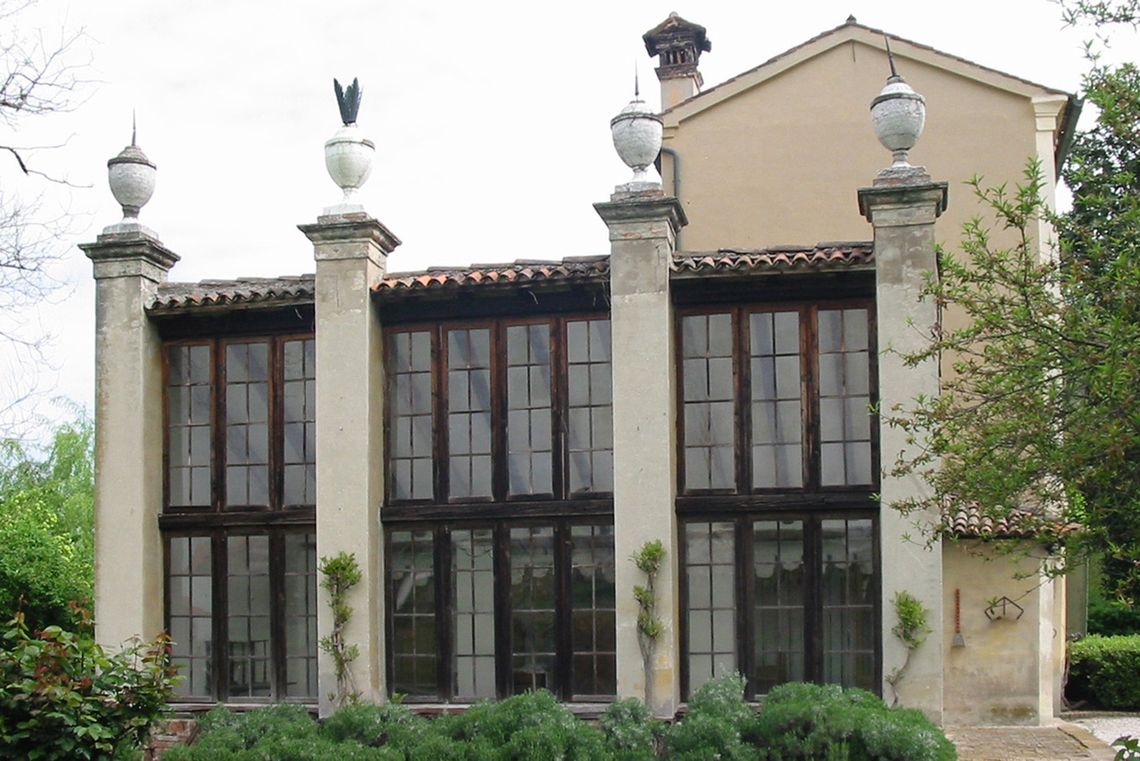 Il corpo padronale si innesta su un profondo pronao esastilo ionico con timpano enfatizzato da un alto basamento e affiancato sui due lati da rampe di scale per l'ascesa al piano nobile. Il prospetto verso il giardino è caratterizzato dalla superficie muraria "disegnata" e dallo sporgere dell'avancorpo centrale su cui campeggia una grande finestra termale.Specifiche: