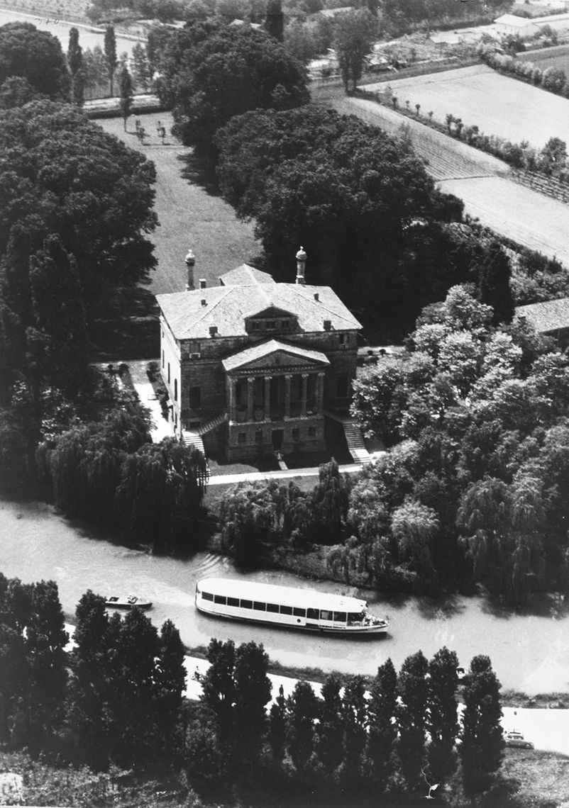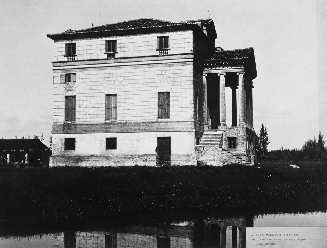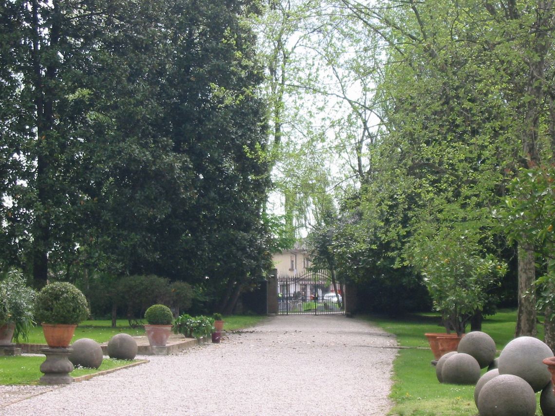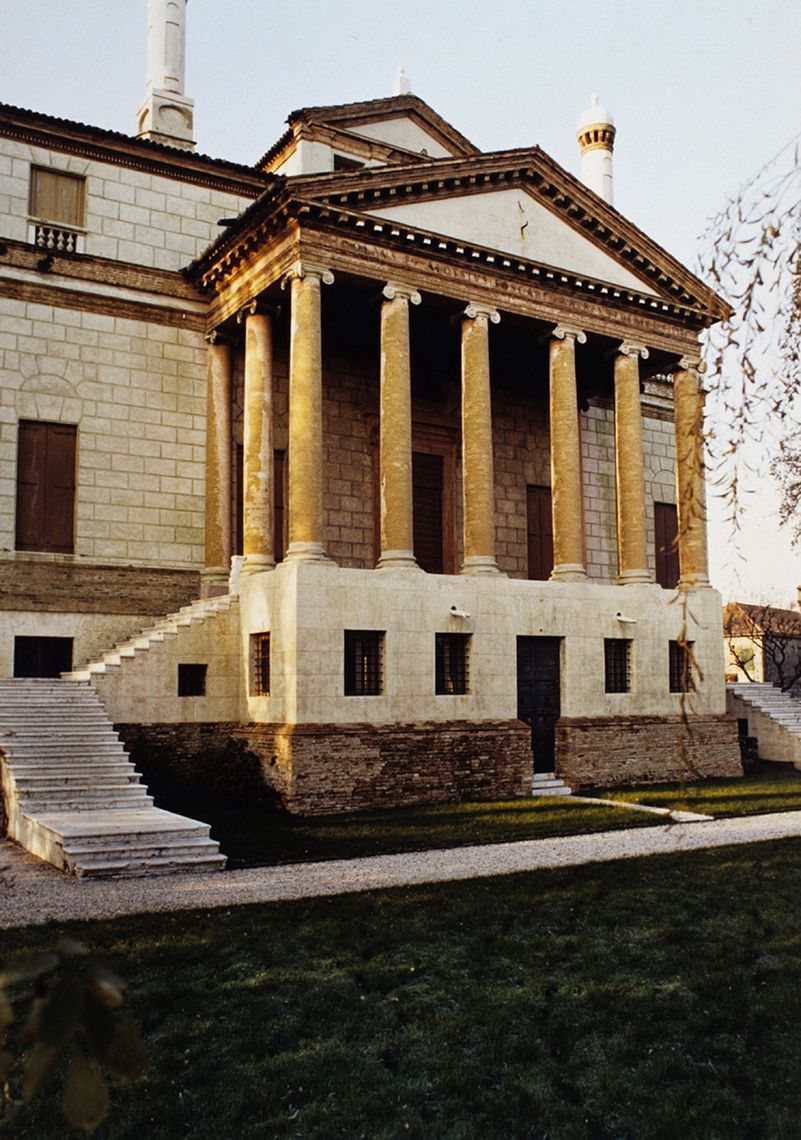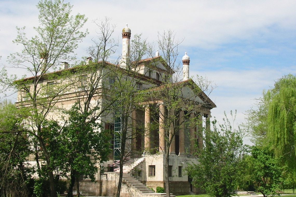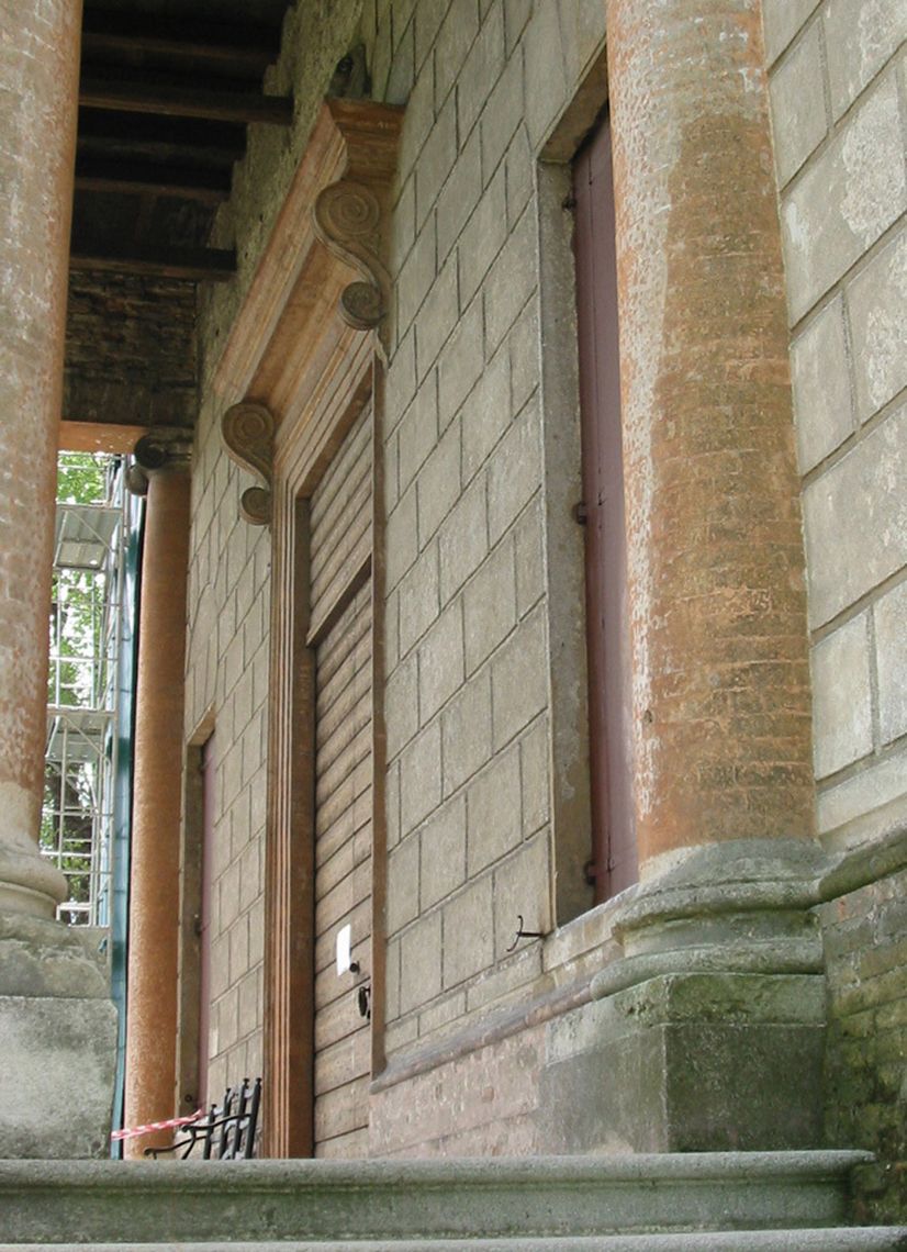 Il corpo padronale si innesta su un profondo pronao esastilo ionico con timpano enfatizzato da un alto basamento e affiancato sui due lati da rampe di scale per l'ascesa al piano nobile. Il prospetto verso il giardino è caratterizzato dalla superficie muraria "disegnata" e dallo sporgere dell'avancorpo centrale su cui campeggia una grande finestra termale.Specifiche: