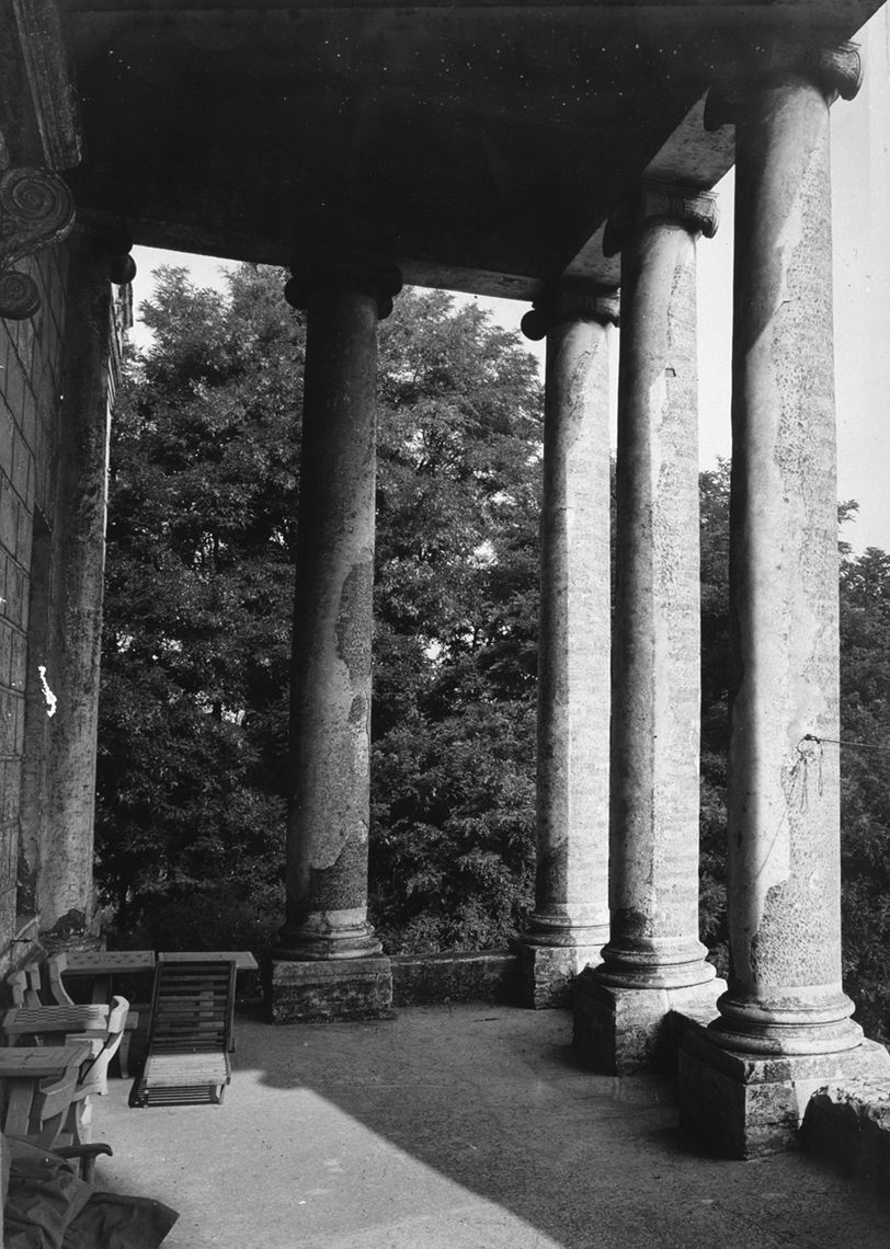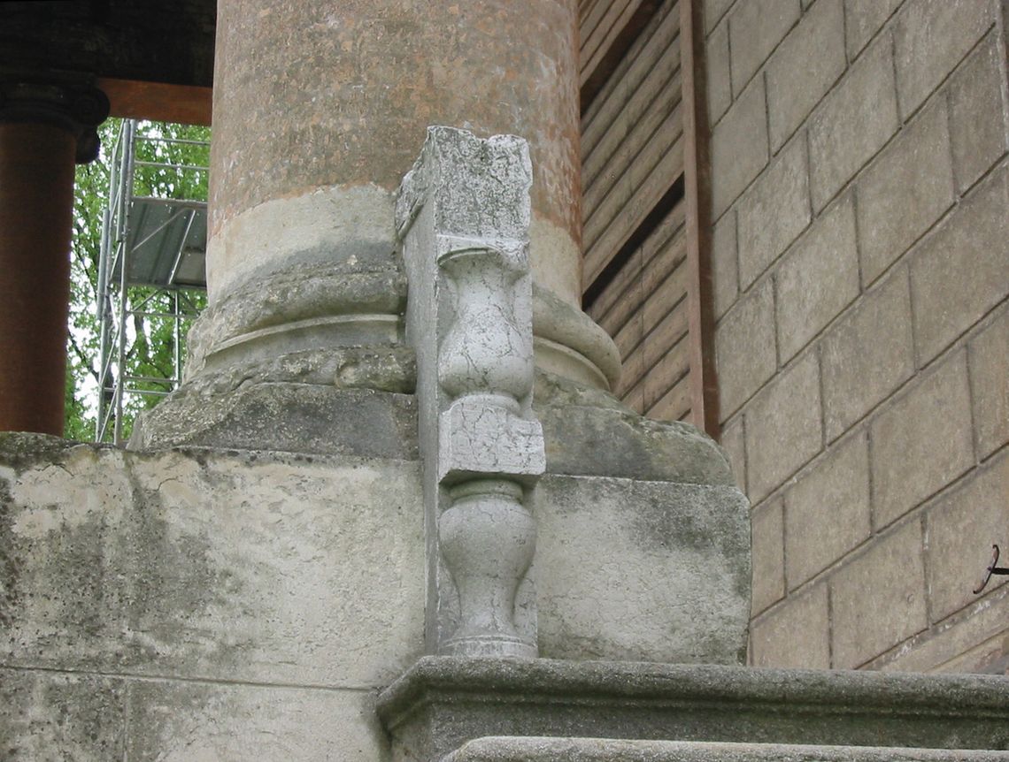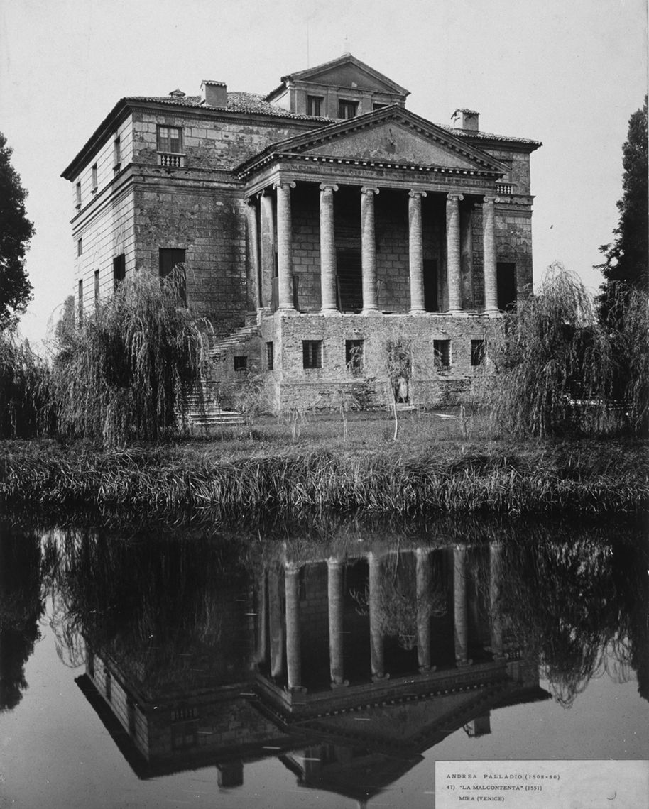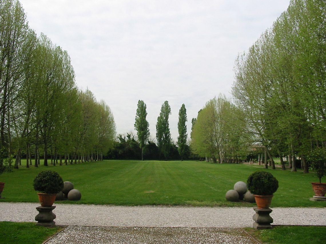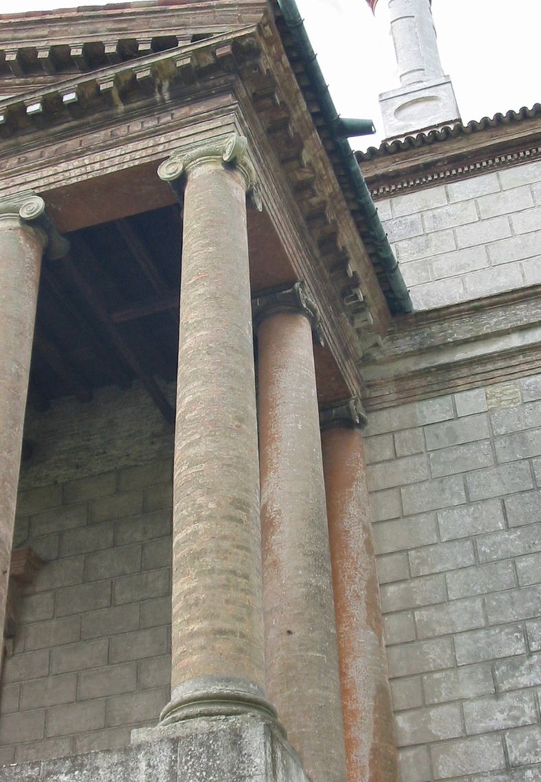Il corpo padronale si innesta su un profondo pronao esastilo ionico con timpano enfatizzato da un alto basamento e affiancato sui due lati da rampe di scale per l'ascesa al piano nobile. Il prospetto verso il giardino è caratterizzato dalla superficie muraria "disegnata" e dallo sporgere dell'avancorpo centrale su cui campeggia una grande finestra termale.Specifiche: