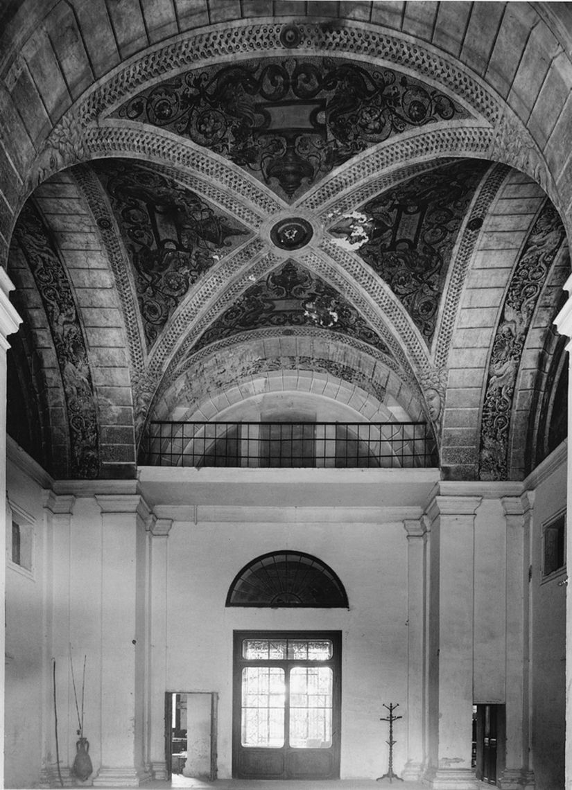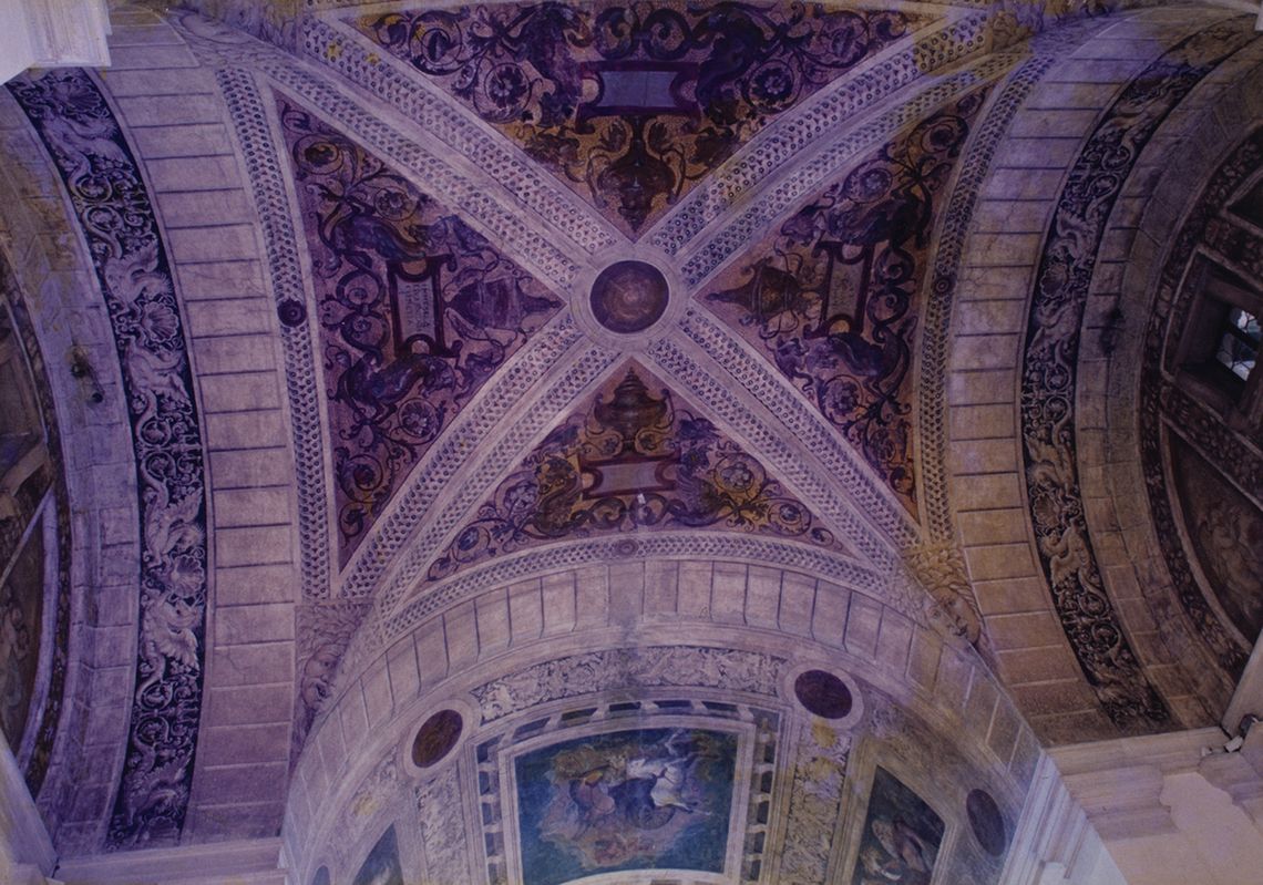 - Descrizione: Nelle quattro vele della volta a crociera, su un fondo a finto mosaico dorato, si stagliano grottesche di notevoli dimensioni, caratterizzate al centro da un vaso poggiante su cartiglio. Negli intradossi degli archi, che coronano i bracci nord, est e sud del vano crociato, si distende una fascia dal fondo scuro, su cui risaltano motivi a grottesca di ascendenza falconettiana. Per quanto riguarda la volta a botte del braccio ovest, allinterno di un sistema di motivi sempre a grottesca monocromi su fondo scuro, tre comparti rettangolari contornati da finte cornici scandiscono lo spazio e ospitano scene del mito di Fetonte, tratte dalle "Metamorfosi" di Ovidio: la "Caduta di Fetonte", nel riquadro centrale; quello posto a sinistra guardando la porta d'ingresso del lato ovest si presenta pressochè illeggibile; infine, quello di destra, compaiono tre figure che vanno interpretate come "Eridano","Clymene" e "Cygnus".