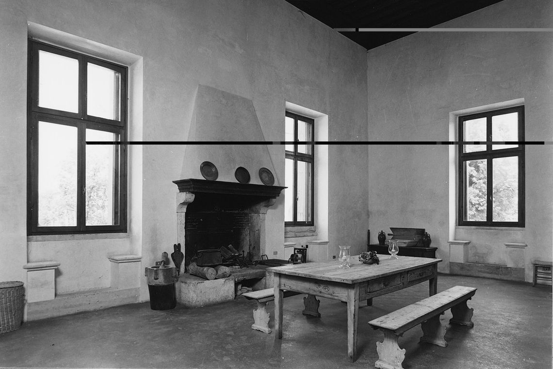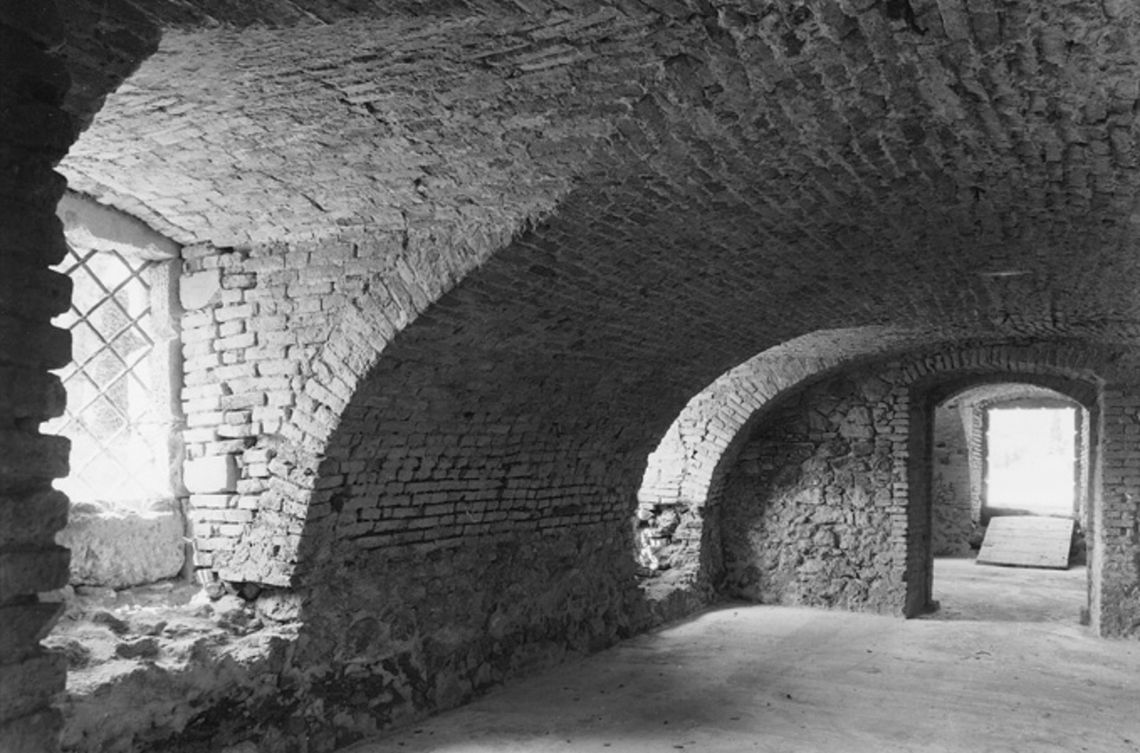 - Descrizione: L'ambiente ha conservato una decorazione pittorica sia sulla volta a padiglione che sulla parte alta delle pareti, mentre sbiaditissima appare quella nella parte inferiore. Oltre alla decorazione a grottesche il soffitto presenta episodi tratti dall "Orlando Furioso" di Ariosto. Il piano dellimposta della volta è sottolineato da un finto cornicione a dentelli, sotto il quale si allinea una serie di ampi riquadri approssimativamente quadrati, separati tra loro da cornici dipinte: ogni pannello rappresenta una scena legata alla tematica in villa la cui fonte di ispirazione potrebbe essere ravvisata nel "Decamerone" di Giovanni Boccaccio.
