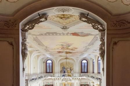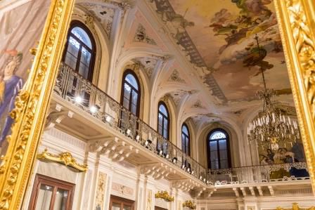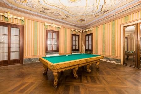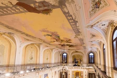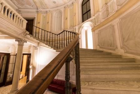 - Descrizione: All'interno del palazzo, il pittore Giacomo Casa, sotto la direzione di Meduna, realizza il sontuoso scalone e allestisce le decorazioni a grandi riquadri delle pareti e del soffitto nella grande sala da ballo.