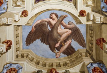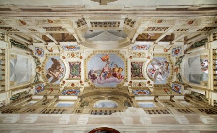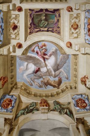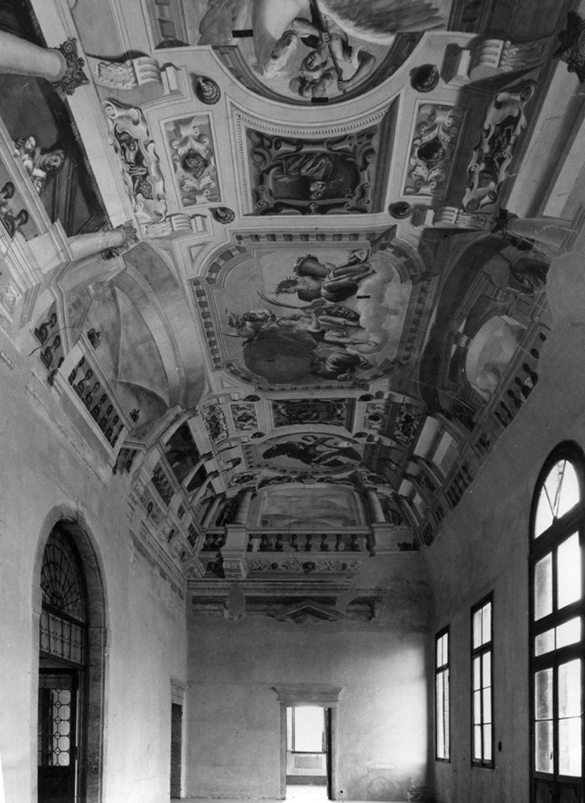 - Descrizione: Al piano nobile, sul soffitto, il ciclo rappresenta scene mitologiche inquadrate da finte architetture, finti loggiati e figure femminili.