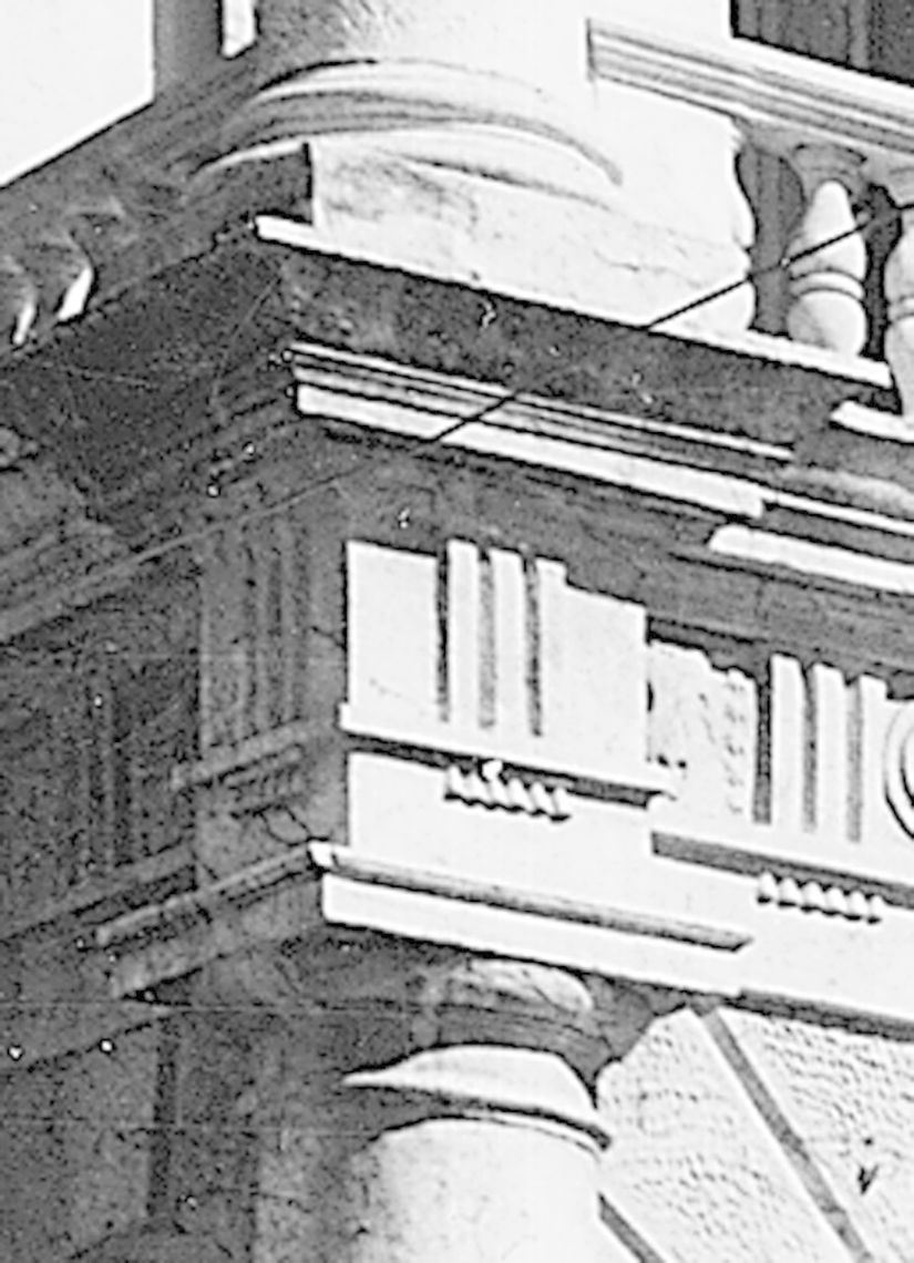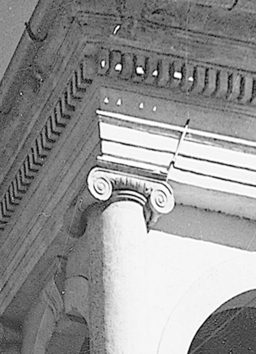 - Descrizione: Una trabeazione a metope triglifi, aggettante in corrispondenza delle semicolonne, conclude l'ordine del piano terra e gira sul fianco dell'edificio.