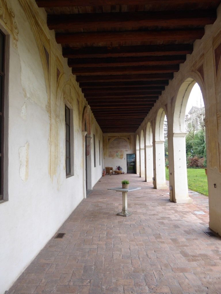- Osservazioni: Porticato annesso alla barchessa più antica, con arcate con decoro in chiave, poggiate su pilastri con lesene addossate. Un cornicione di gronda a dentelli poggia direttamente sulle lesene.