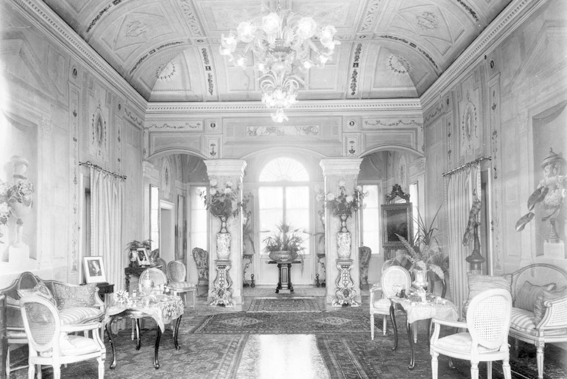 - Descrizione: Il soffitto a volta del salone, pressoché interamente a monocromo, è suddiviso a comparti regolari, con festoni vegetali: sul bordo, aquile con cornucopie; nella zona centrale, motivi vegetali compresi in quadrati intorno a un tondo con fontane, volti di fanciulli e uccelli. Nelle parti mediane, quattro scene a chiaroscuro: una figura femminile con arco ("Diana") a ovest, di fronte unaltra con cane, a nord una scena di vendemmia, di fronte una figura femminile con putti. Agli angoli, testine raggiate di sole. Le pareti maggiori sono riquadrate da finte specchiature marmoree in grigio e candelabre: nelle zone centrali, nicchie con grandi vasi (vaso rosso con teste di caprone a ovest, a est vaso in giallo con fiori). A nord, le finestre e la porta sono incorniciate da fasce in colore di fiori, frutti e placchette. Analoga decorazione è sulla parete sud. Nelle quattro sovrapporte, infine, medaglioni in forma di mandorla con le "Stagioni" su fondo di finto marmo verde.