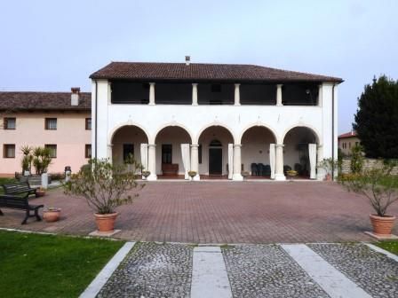 - Descrizione: Quattro colonne su basi a dado e due semicolonne sostengono le cinque arcate centrali del portico al piano terra; altre quattro piccole colonne e due semicolonne sostengono l'architrave ligneo della loggia al piano superiore.