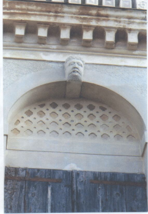 - Descrizione: Il piano nobile è illuminato da alte finestre a monofora archivoltata con lunetta tamponata decorata a losanghe, e hanno il concio in chiave aggettante; quelle del settore centrale, raggruppate a formare una trifora, sono decorate da testine in chiave.