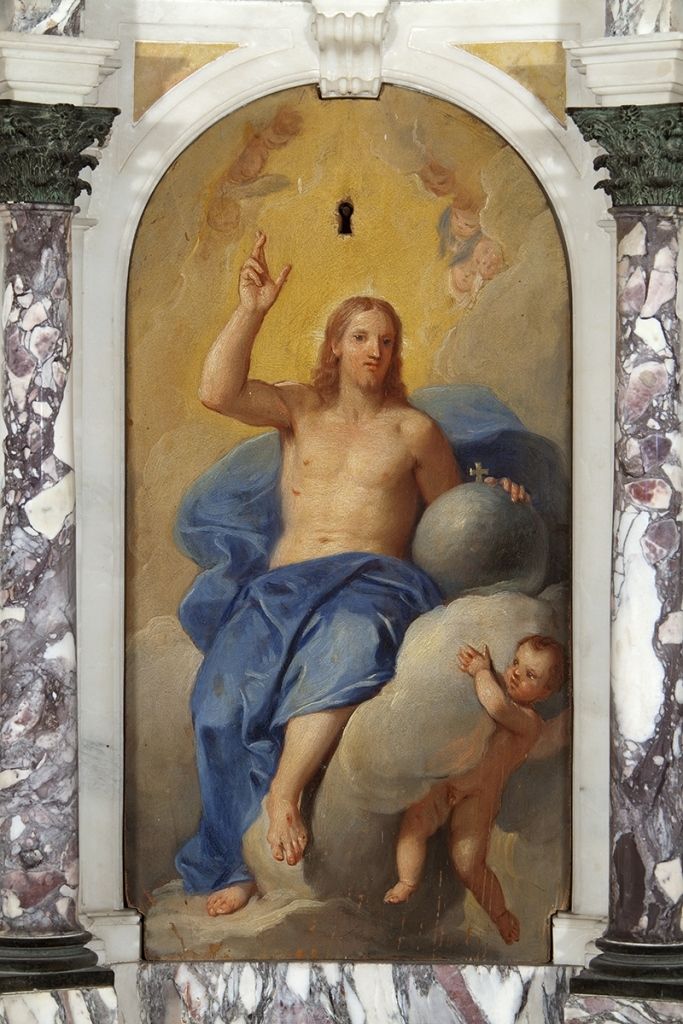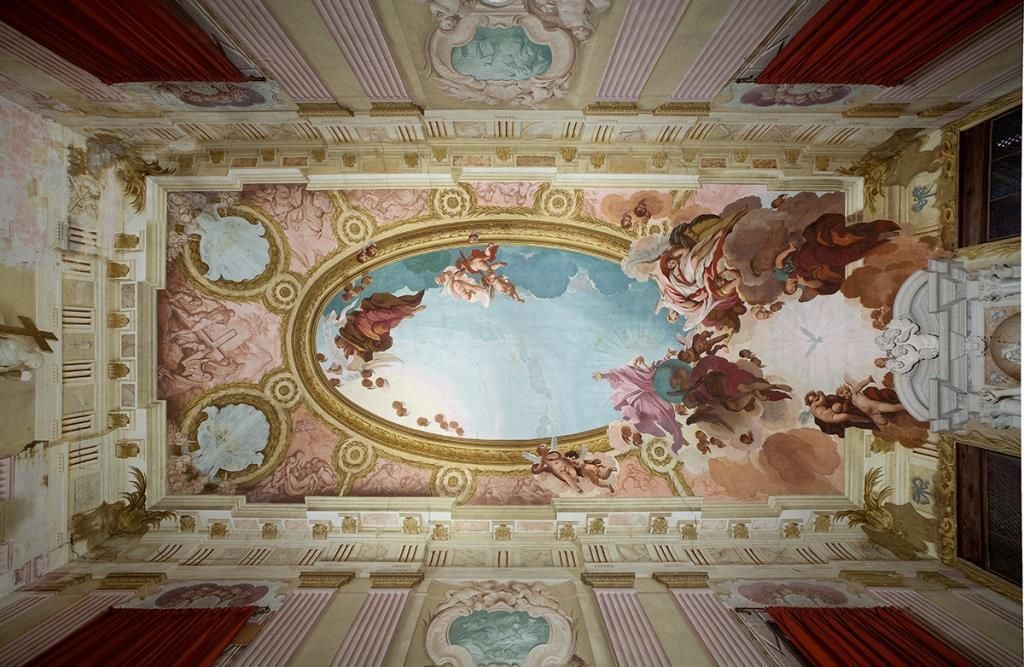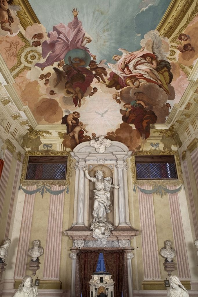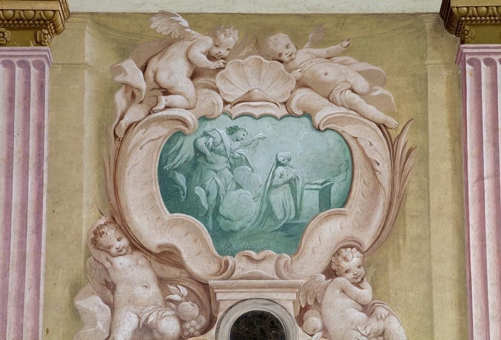 - Descrizione: Il ciclo pittorico si estende su tutte le pareti della chiesa, dal soffitto fino a terra e le figure sono collocate entro o sulle cornici di una quadratura in finti marmi con finti stucchi vegetali. Sul soffitto trova posto la figurazione del "Padre eterno con la Colomba dello Spirito Santo e Angeli accogli il Salvatore". Sulle pareti sono affrescate finte modanature, con cartigli e raffigurazioni in monocromo, con la "Cena di Emmaus", "Cristo fra i Dottori", "La cacciata dei mercanti dal Tempio", "Cristo cade sotto la Croce", "la deposizione", "Cristo al Limbo", "Le Marie al Sepolcro", "L'orazione dell'orto", mentre nelle sovrapposte in monocromo verde compaiono "L'Annunciazione" e "La Natività".