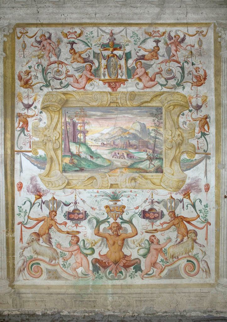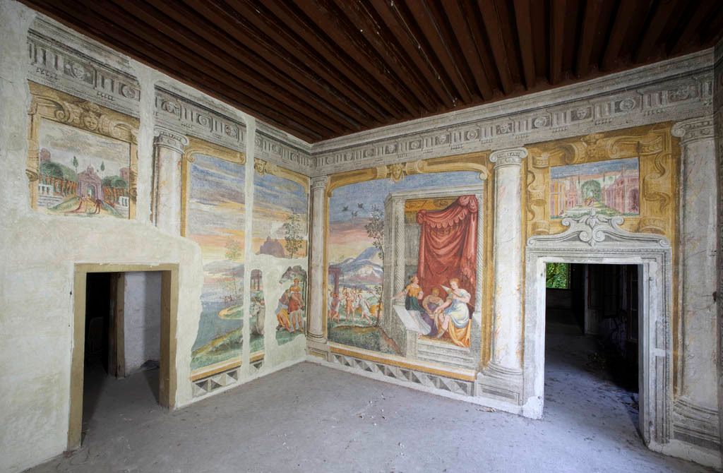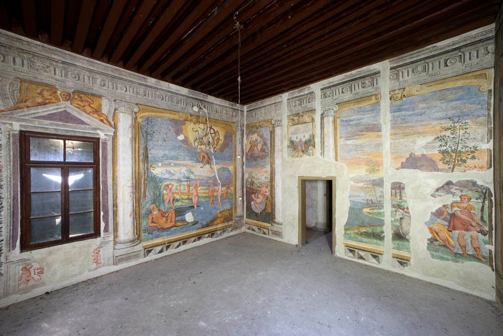 - Descrizione: Entro una struttura architettonica, di stampo teatrale, si trovano gli episodi narrativi tratti dalle "Metamorfosi" di Ovidio. Entrando a sinistra, "Meleagro e le Parche", il "Ratto di Europa", "Giove e Danae" e la "Caduta di Fetonte". Sopra le finestre è un finto timpano reggente coppie di figure femminili allegoriche. Sopra le porte è un finto quadro riportato raffigurante prospettive di città e di ville.
