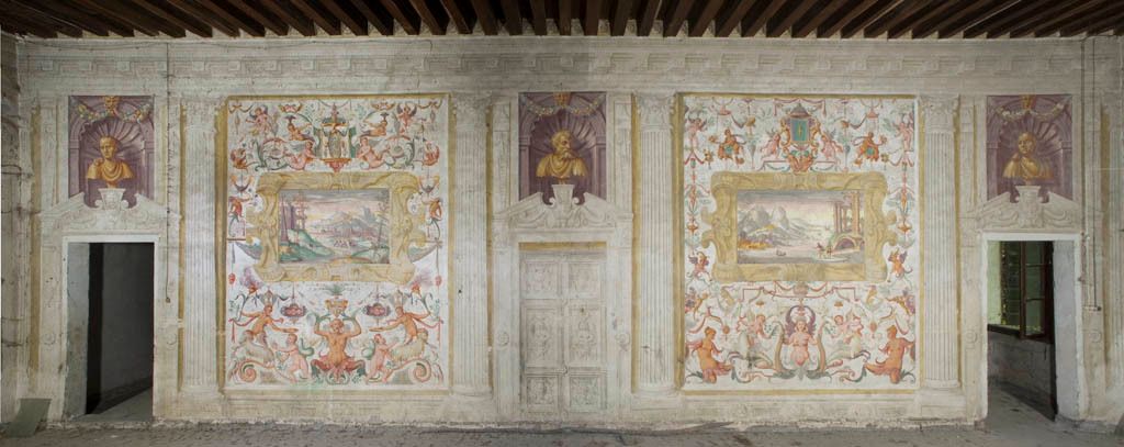 - Descrizione: La prima stanza che si apre a destra verso il salone passante risulta priva di affreschi visibili sotto lo scialbo, mentre nella seconda sono state portate in luce solo due figure allegoriche sulle sovrapporte.
