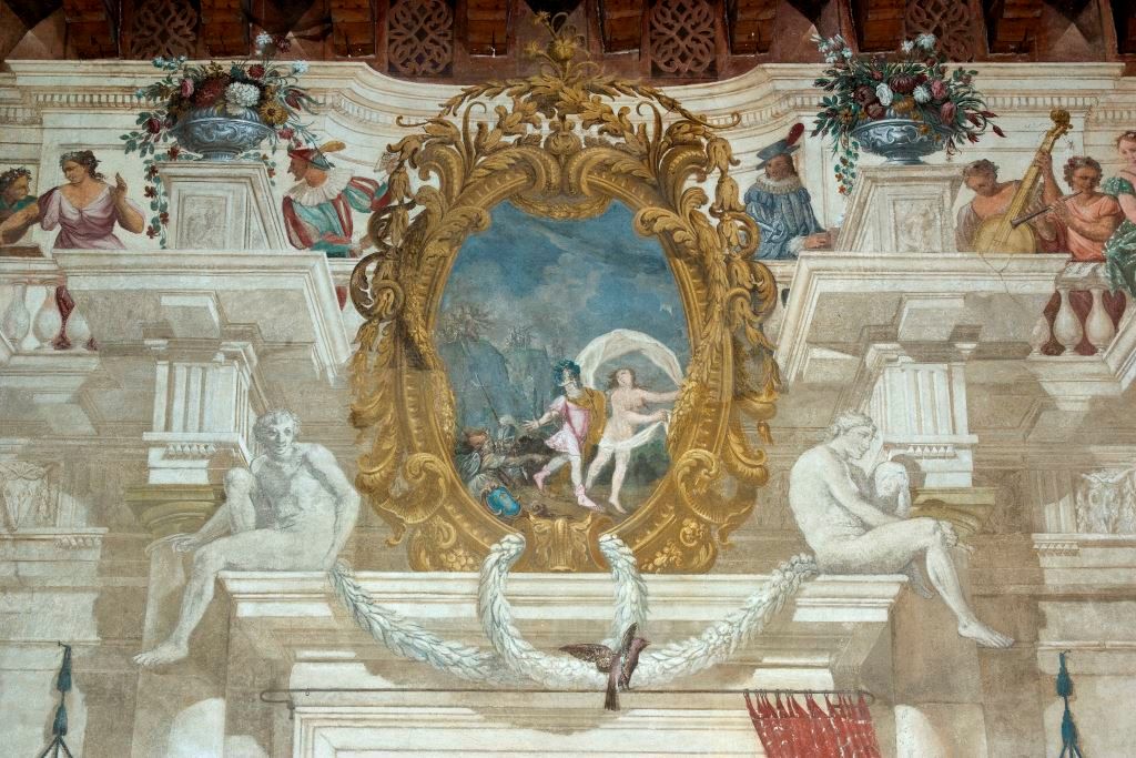 - Descrizione: Stanza al primo piano della foresteria. Vi è un fregio continuo che corre sotto le travature alla sansovina, le porte e le finestre sono inquadrate da cornici architettoniche. Particolarità sono le quindici imprese araldiche rappresentate entro cartocci colorati su sfondo rosso accompagnate da iscrizioni.