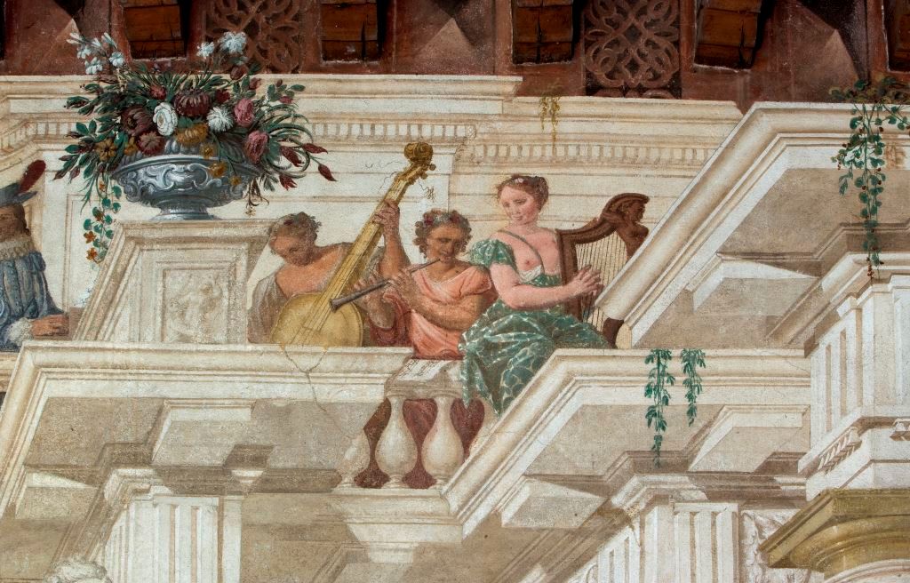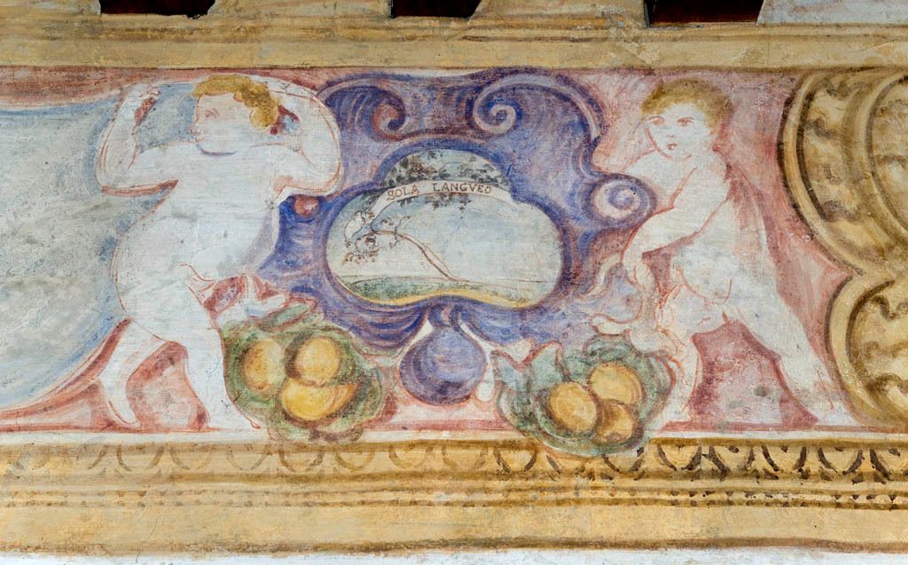 - Descrizione: Affreschi nell'ambiente a ovest. Rappresentazioni di un colonnato reggente una trabeazione a metope e trigrifi che inquadrano alcune vedute sormontate da festoni floreali.