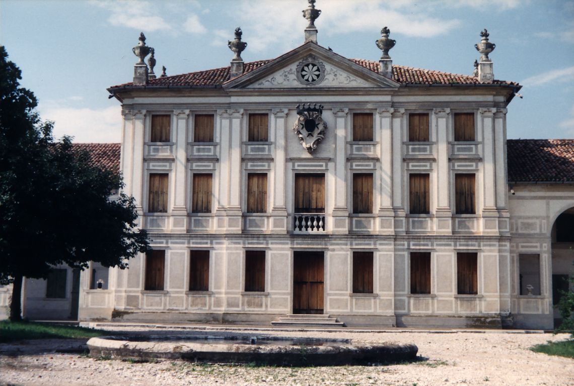 - Descrizione: La facciata è scandita da lesene di ordine gigante che, partendo dal primo piano, sostengono visivamente la trabeazione su cui s'imposta la copertura. In corrispondenza del salone passante e agli angoli sono binate.