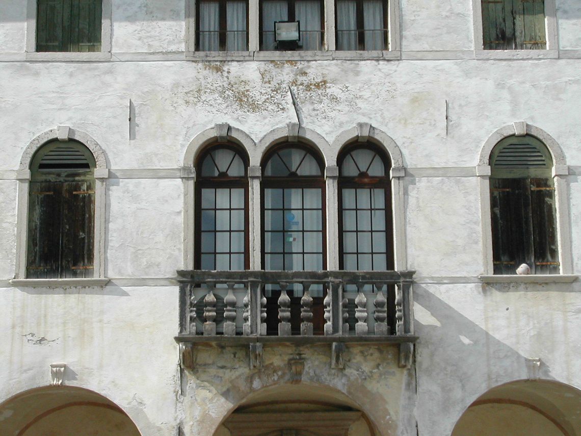 - Descrizione: La trifora centinata sopra il portale centrale presenta un balcone dall'elegante poggiolo su quattro mensole sagomate e con parapetto a balaustrini di elaborato disegno.