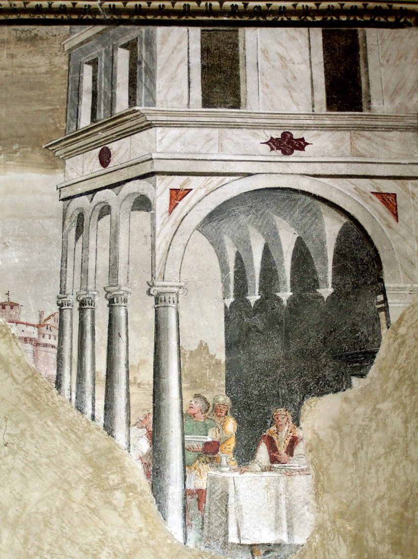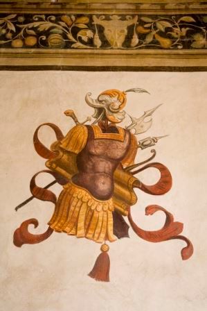 - Descrizione: Del ciclo originario restano due riquadri con scene tratte dall' "Orlando Furioso", la fascia sottotrave che imita un'alta trabeazione sostenuta da finti peducci a voluta ed erme, tra le quali si dispongono figure mitologiche, composizioni di elementi vegetali e panoplie.