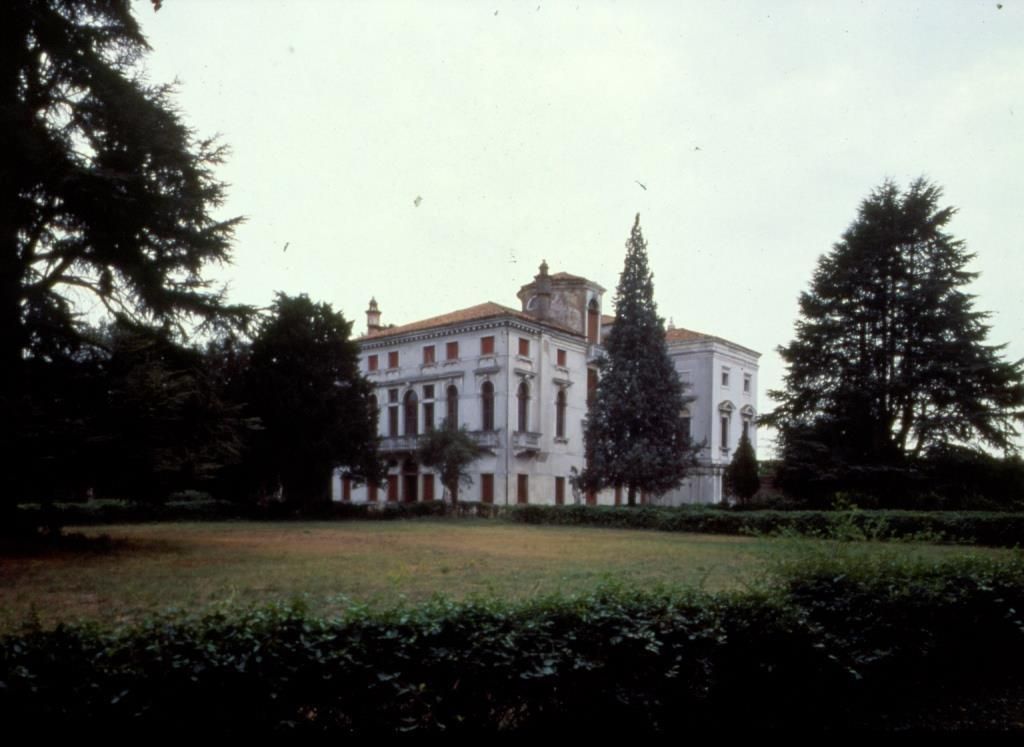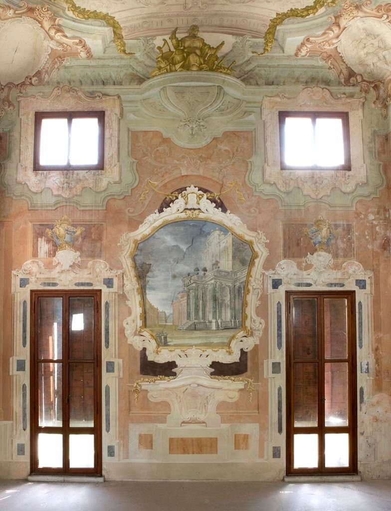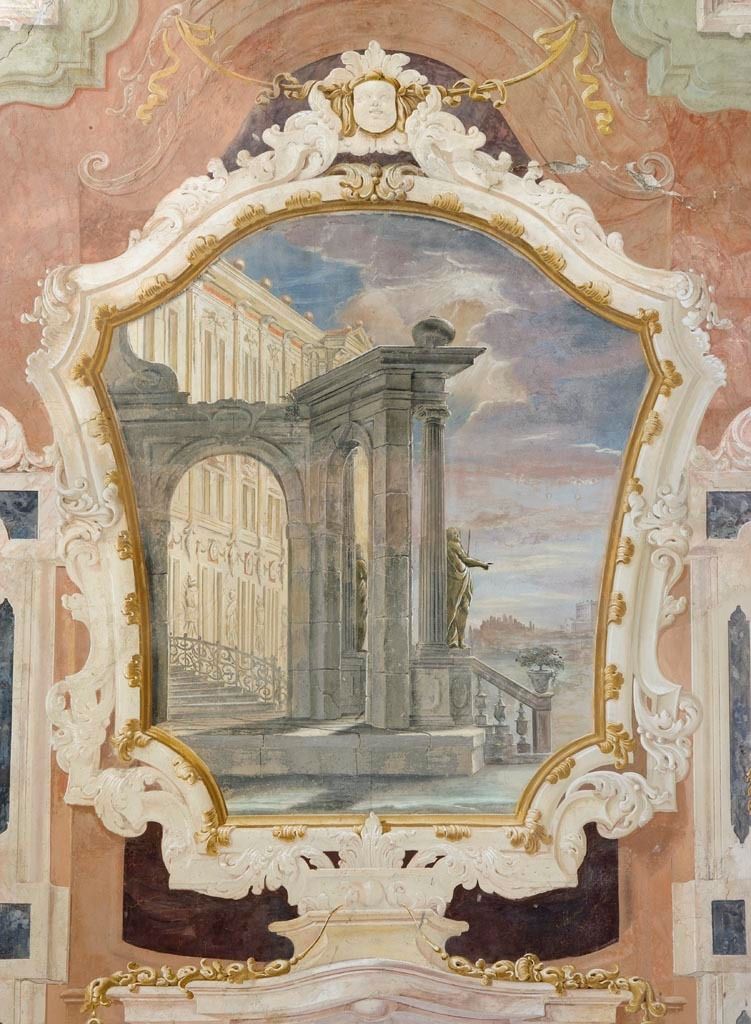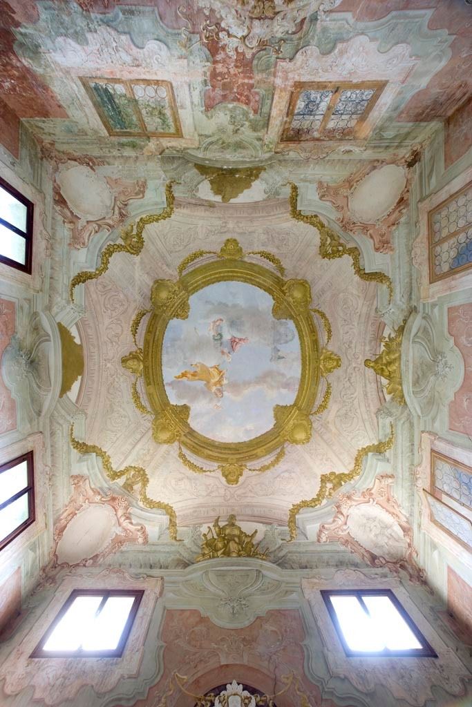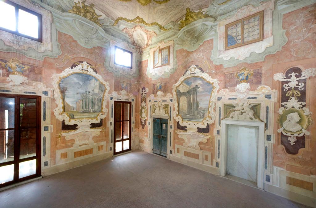 - Descrizione: Nel portego al piano terra, ma anche nel salone, nel vestibolo e nella scala ovale del piano nobile della villa, sono presenti decorazioni a quadrature con raffigurazioni che si alternano (allegoriche, ritratti di dame, animali, fontane;...) con colonne tortili che ne delimitano le "scene".