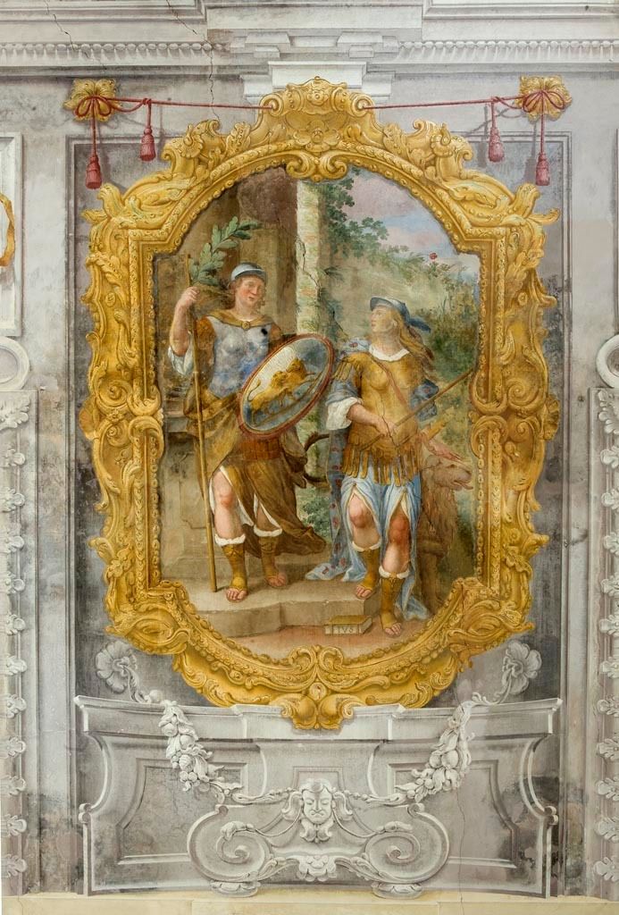 - Descrizione: Al piano nobile della villa, e più precisamente nella stanza sud-est, pur dichiarando palesemente l'appartenenza a un ambito di gusto più evoluto, gli affreschi di questa stanza propongono nelle linee generali, uno schema decorativo analogo a quello della stanza corrispondente sull'altro lato del vestibolo; qui sono presenti affreschi scenografici con fantasie architettoniche e nature morte.