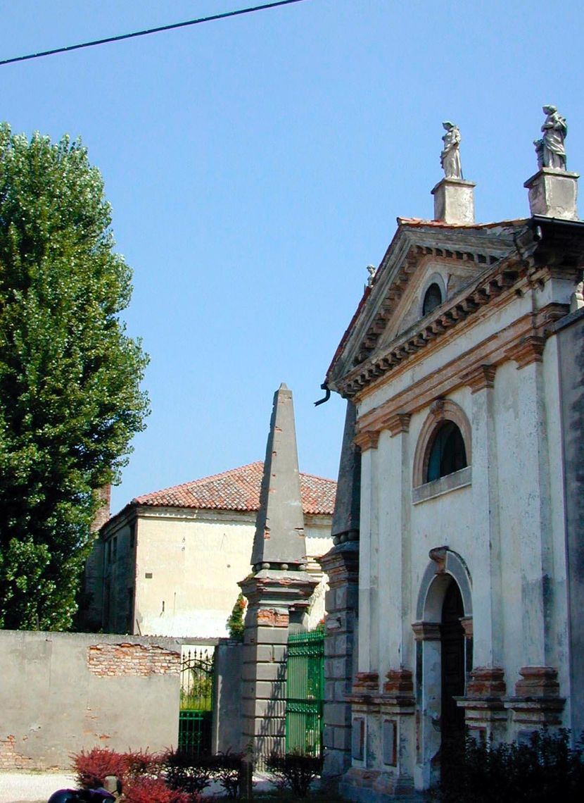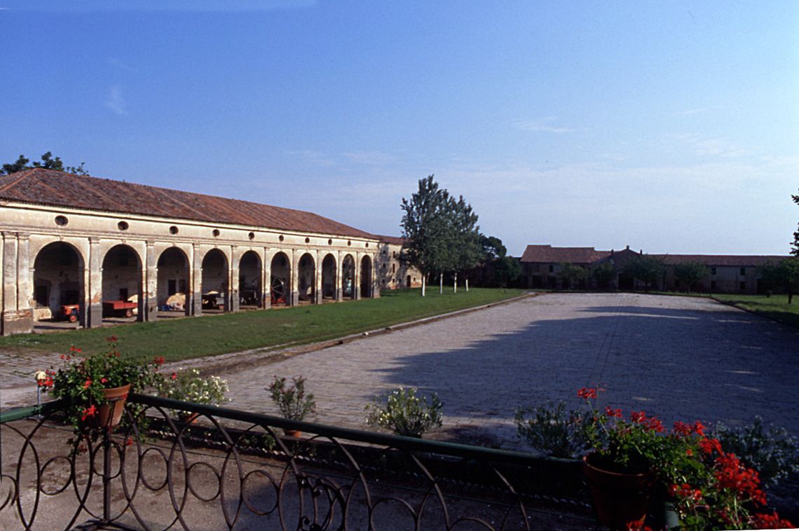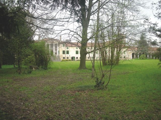 Insieme di edifici articolato. La villa ha impianto palladiano con alto pronao sporgente, cui si accede tramite una gradinata. Ha due piani più soffitte. Le barchesse a dieci e sei fornici e le due torri colombare limitano il cortile. Tra le torri un secondo ingresso di fronte alla villa. Sono presenti giardino con statue, parco con alberi secolari, ghiacciaia. Il complesso è cinto di mura.Elementi Decorativi: