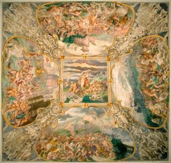 - Descrizione: 004192 - Affresco; riquadro con "Deucalione e Pirra" al centro del soffitto della stanza al piano terra e ambiente adiacente. L'affresco è circondato da quattro scene di battaglia tratte dalla mitologia greco-romana. Le altre raffigurazioni sono: "Ercole che conquista il cinto di Ippolita", "Ratto delle Sabine", "Lotta tra Lapiti e Centauri", "Amazzoni in soccorso di Troia". La Decorazione è stata voluta dal proprietario della villa che desiderava collegare la propria famiglia a Roma.